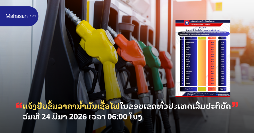 ແຈ້ງປັບ​ຂຶ້ນ​ລາ​ຄາ​ນ້ຳ​ມັນ​ເຊື້ອ​ໄຟ​ໃນ​ຂອບ​ເຂດ​ທົ່ວ​ປະ​ເທດເລີ່ມ​ປະ​ຕິ​ບັດ ວັນ​ທີ 24 ມີ​ນາ 2026 ເວ​ລາ 06:00 ໂມງ