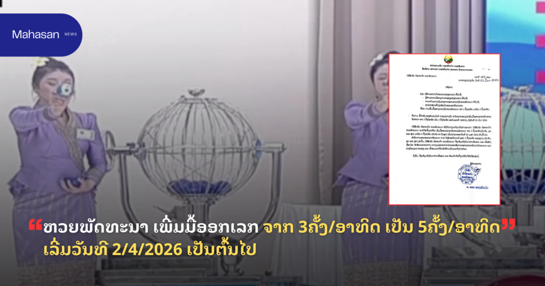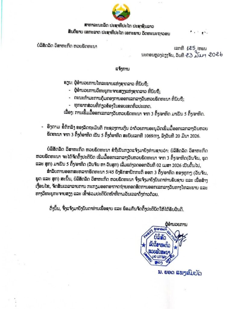 ແຈ້ງການ ຫວຍພັດທະນາ ເພີ່ມມື້ອອກເລກ ຈາກ 3ຄັ້ງ/ອາທິດ ເປັນ 5ຄັ້ງ/ອາທິດ ເລີ່ມວັນທີ 2/4/2026 ເປັນຕົ້ນໄປ By Jenjila ທີ 24 March, 2026 0 59 Share FacebookTwitterPinterestWhatsApp Must read ເມື່ອພີ່ດື້ຊ້າງປ່າແຫ່ງອຸທິຍານແຫ່ງຊາດເຂົາໃຫຍ່ແຂກໂຕນ້ອຍຢາກກິນຕຳບັກຫຸ່ງ… ຄວາມວຸ່ນວາຍທີ່ໜ້າຮັກຈຶ່ງເກີດຂຶ້ນ! ທີ 3 April, 2026 M moneyX ຮ່ວມມືກັບ Visa ເພື່ອເປີດທົດລອງບັດ VISA Prepaid Card ແລະ ພັດທະນາ Visa Pay ເພື່ອການຊຳລະເງິນດິຈິຕອນໃນລາວ ເເລະ ສາກົນ ທີ 3 April, 2026 ຈີນ ຮຽກຮ້ອງທົ່ວໂລກຮ່ວມມື ປາບປາມການສໍ້ໂກງ ທາງຄົມມະນາຄົມ-ອາຊະຍາກຳໄຊເບີຣ ທີ 3 April, 2026 ແຈ້ງການມອດໄຟ ວັນທີ 04,05/04/2026 ທີ 3 April, 2026 Jenjila ຫວຍພັດທະນາ ເພີ່ມມື້ອອກເລກ ຈາກ 3ຄັ້ງ/ອາທິດ ເປັນ 5ຄັ້ງ/ອາທິດ ເລີ່ມວັນທີ 2/4/2026 ເປັນຕົ້ນໄປ ລາຍລະອຽດດັ່ງລຸ່ມນີ້: Share FacebookTwitterPinterestWhatsApp Previous articleລາຄາຄຳໂລກປັບຕົວຫຼຸດລົງຢ່າງຕໍ່ເນື່ອງ ທ່າມກາງຄວາມກັງວົນຕໍ່ສົງຄາມອີຣານ ແລະ ສະພາວະຕະຫຼາດຜັນຜວນNext articleອັບເດດປ້ຳນ້ຳມັນທີ່ເປີດໃຫ້ບໍລິການທັງໝົດ 122 ປໍ້າ ທົ່ວນະຄອນຫລວງວຽງຈັນ ວັນທີ 24 ມີນາ 2026 More articles ແຈ້ງການມອດໄຟ ວັນທີ 04,05/04/2026 ທີ 3 April, 2026 ແຈ້ງການມອດໄຟ ວັນທີ 3/4/2026 ບ້ານ ໂພນຕ້ອງສະຫວາດ ເມືອງ ຈັນທະບູລີ ທີ 2 April, 2026 ແຈ້ງການ ກົມການຄ້າພາຍໃນ ກະຊວງ ອຸດສາຫະກຳ ແລະ ການຄ້າ ທີ 1 April, 2026 LEAVE A REPLY Cancel reply Comment: Please enter your comment! Name:* Please enter your name here Email:* You have entered an incorrect email address! Please enter your email address here Website: Save my name, email, and website in this browser for the next time I comment. - Advertisement - Latest article ເມື່ອພີ່ດື້ຊ້າງປ່າແຫ່ງອຸທິຍານແຫ່ງຊາດເຂົາໃຫຍ່ແຂກໂຕນ້ອຍຢາກກິນຕຳບັກຫຸ່ງ… ຄວາມວຸ່ນວາຍທີ່ໜ້າຮັກຈຶ່ງເກີດຂຶ້ນ! ທີ 3 April, 2026 M moneyX ຮ່ວມມືກັບ Visa ເພື່ອເປີດທົດລອງບັດ VISA Prepaid Card ແລະ ພັດທະນາ Visa Pay ເພື່ອການຊຳລະເງິນດິຈິຕອນໃນລາວ ເເລະ ສາກົນ ທີ 3 April, 2026 ຈີນ ຮຽກຮ້ອງທົ່ວໂລກຮ່ວມມື ປາບປາມການສໍ້ໂກງ ທາງຄົມມະນາຄົມ-ອາຊະຍາກຳໄຊເບີຣ ທີ 3 April, 2026 ແຈ້ງການມອດໄຟ ວັນທີ 04,05/04/2026 ທີ 3 April, 2026 ລາຍງານສະພາບອາກາດປະຈໍາວັນທີ 03 ເມສາ 2026 ທີ 3 April, 2026