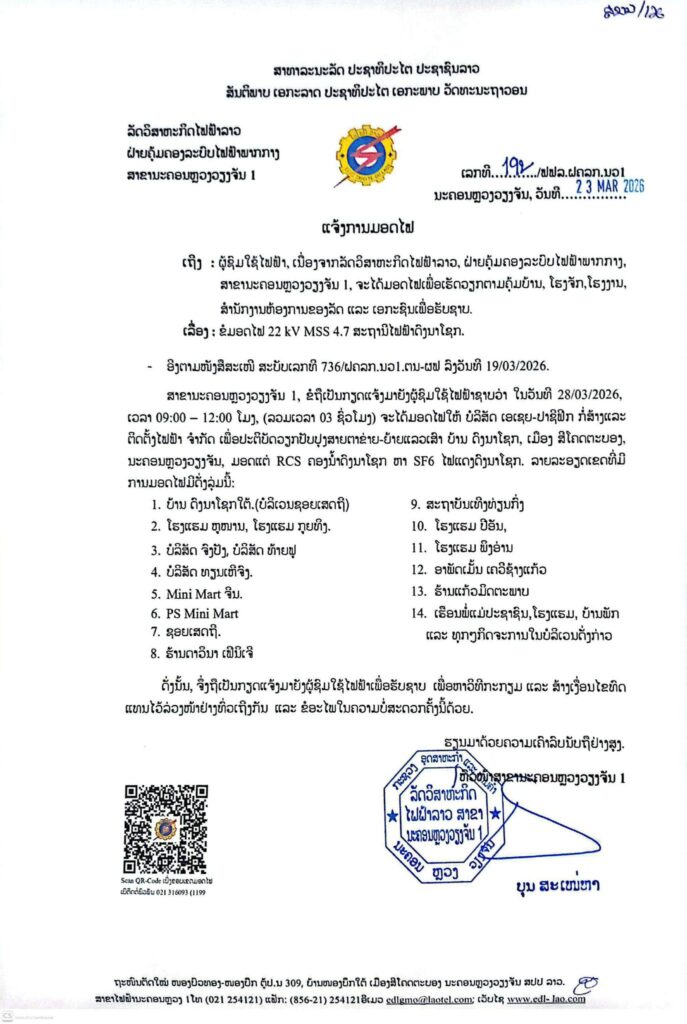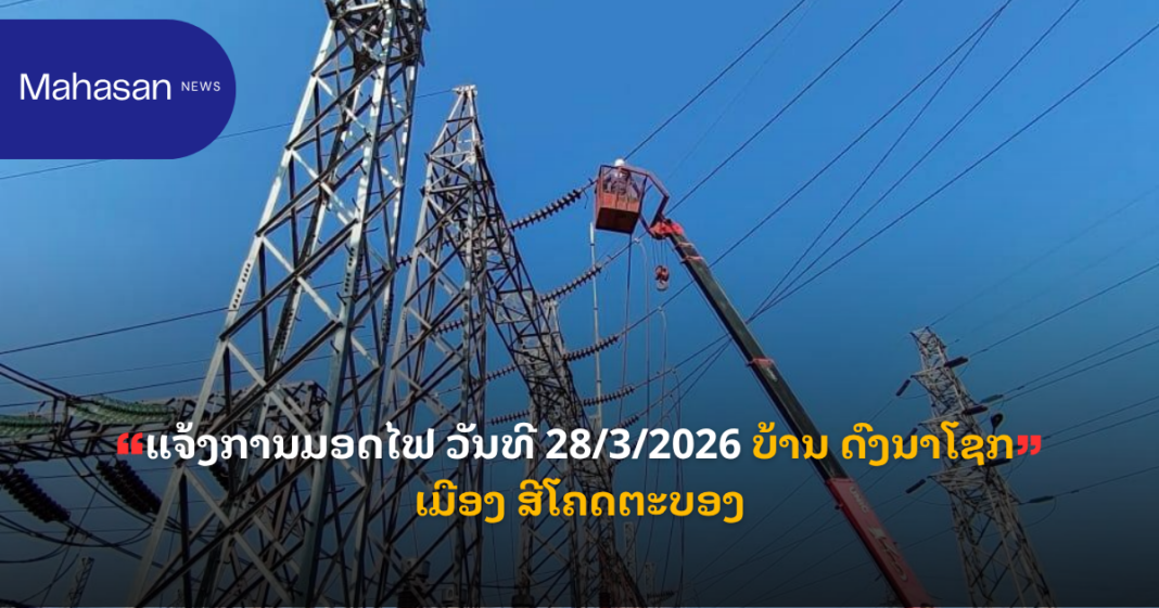 ແຈ້ງການ ແຈ້ງການມອດໄຟ ວັນທີ 28/3/2026 ບ້ານ ດົງນາໂຊກ ເມືອງ ສີໂຄດຕະບອງ By Pele ທີ 24 March, 2026 0 1608 Share FacebookTwitterPinterestWhatsApp Must read ເມື່ອພີ່ດື້ຊ້າງປ່າແຫ່ງອຸທິຍານແຫ່ງຊາດເຂົາໃຫຍ່ແຂກໂຕນ້ອຍຢາກກິນຕຳບັກຫຸ່ງ… ຄວາມວຸ່ນວາຍທີ່ໜ້າຮັກຈຶ່ງເກີດຂຶ້ນ! ທີ 3 April, 2026 M moneyX ຮ່ວມມືກັບ Visa ເພື່ອເປີດທົດລອງບັດ VISA Prepaid Card ແລະ ພັດທະນາ Visa Pay ເພື່ອການຊຳລະເງິນດິຈິຕອນໃນລາວ ເເລະ ສາກົນ ທີ 3 April, 2026 ຈີນ ຮຽກຮ້ອງທົ່ວໂລກຮ່ວມມື ປາບປາມການສໍ້ໂກງ ທາງຄົມມະນາຄົມ-ອາຊະຍາກຳໄຊເບີຣ ທີ 3 April, 2026 ແຈ້ງການມອດໄຟ ວັນທີ 04,05/04/2026 ທີ 3 April, 2026 Pele ທີ່ມາ:EDL LAOS ລັດວິສາຫະກິດໄຟຟ້າລາວ ສາຂານະຄອນຫຼວງ1 Share FacebookTwitterPinterestWhatsApp Previous articleສຳນັກຂ່າວຣອຍເຕີລາຍງານເກີດເຫດໄຟໄໝ້ຄັ້ງໃຫຍ່ຢູ່ໂຮງກັ່ນນ້ຳມັນໃນລັດເທັກຊັດ (Texas)Next articleໂຄລົມເບຍເລັ່ງສືບສວນຫາສາເຫດ ເຮືອບິນກອງທັບຕົກ ເຮັດໃຫ້ທະຫານເສຍຊີວິດສູງເຖິງ 66 ຄົນ. More articles ແຈ້ງການມອດໄຟ ວັນທີ 04,05/04/2026 ທີ 3 April, 2026 ແຈ້ງການມອດໄຟ ວັນທີ 3/4/2026 ບ້ານ ໂພນຕ້ອງສະຫວາດ ເມືອງ ຈັນທະບູລີ ທີ 2 April, 2026 ແຈ້ງການ ກົມການຄ້າພາຍໃນ ກະຊວງ ອຸດສາຫະກຳ ແລະ ການຄ້າ ທີ 1 April, 2026 LEAVE A REPLY Cancel reply Comment: Please enter your comment! Name:* Please enter your name here Email:* You have entered an incorrect email address! Please enter your email address here Website: Save my name, email, and website in this browser for the next time I comment. - Advertisement - Latest article ເມື່ອພີ່ດື້ຊ້າງປ່າແຫ່ງອຸທິຍານແຫ່ງຊາດເຂົາໃຫຍ່ແຂກໂຕນ້ອຍຢາກກິນຕຳບັກຫຸ່ງ… ຄວາມວຸ່ນວາຍທີ່ໜ້າຮັກຈຶ່ງເກີດຂຶ້ນ! ທີ 3 April, 2026 M moneyX ຮ່ວມມືກັບ Visa ເພື່ອເປີດທົດລອງບັດ VISA Prepaid Card ແລະ ພັດທະນາ Visa Pay ເພື່ອການຊຳລະເງິນດິຈິຕອນໃນລາວ ເເລະ ສາກົນ ທີ 3 April, 2026 ຈີນ ຮຽກຮ້ອງທົ່ວໂລກຮ່ວມມື ປາບປາມການສໍ້ໂກງ ທາງຄົມມະນາຄົມ-ອາຊະຍາກຳໄຊເບີຣ ທີ 3 April, 2026 ແຈ້ງການມອດໄຟ ວັນທີ 04,05/04/2026 ທີ 3 April, 2026 ລາຍງານສະພາບອາກາດປະຈໍາວັນທີ 03 ເມສາ 2026 ທີ 3 April, 2026
