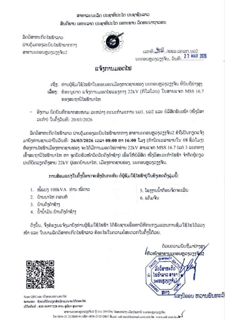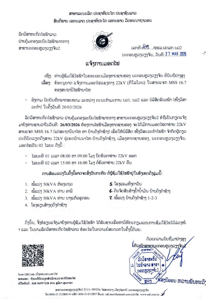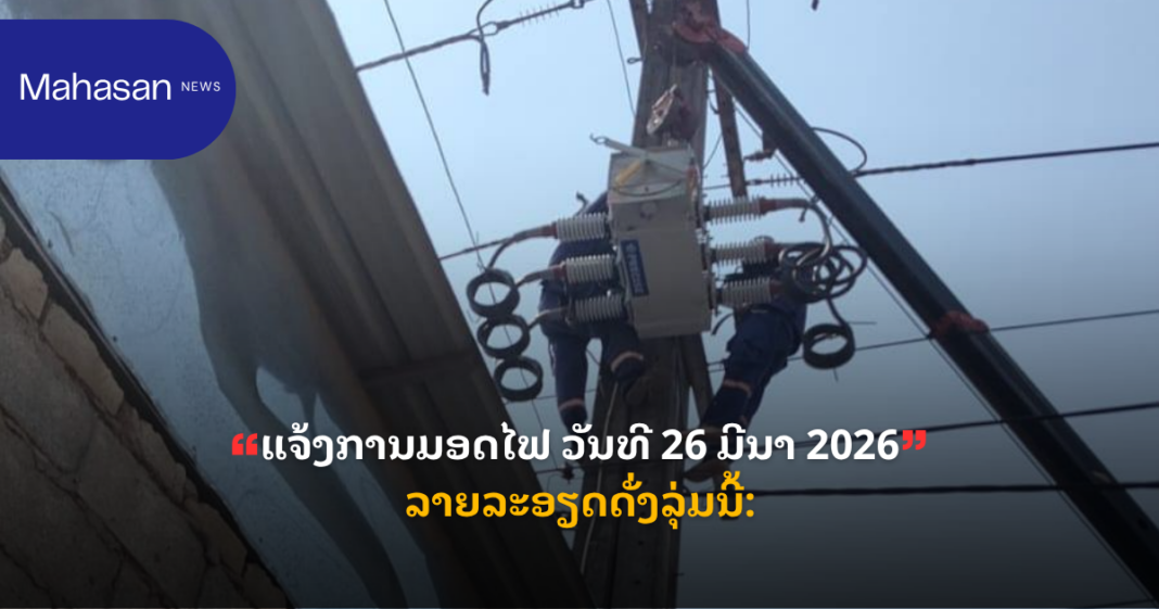 ແຈ້ງການ ແຈ້ງການມອດໄຟ ວັນທີ 26 ມີນາ 2026ລາຍລະອຽດດັ່ງລຸ່ມນີ້: By Pele ທີ 24 March, 2026 0 9919 Share FacebookTwitterPinterestWhatsApp Must read ກວດພົບໂຮງງານຜະລິດນໍ້າມັນເຊື້ອໄຟ ບໍ່ໄດ້ຄຸນນະພາບ ແລະ ປະລິມານການຜະລິດທີ່ນໍາເຂົ້າດ້ວຍສານມາກເກີ ພ້ອມທັງພົບຄ່າຊັນເຟີສູງ 1.331 PPM ເກີນມາດຕະຖານທີ່ກໍານົດ ທີ 6 April, 2026 ແຈ້ງເຕືອນສະພາບຝຸ່ນ (PM2.5) ປະຈໍາວັນທີ 6 ເມສາ 2026 ທີ 6 April, 2026 ລາຍງານສະພາບອາກາດປະຈໍາວັນທີ 06 ເມສາ 2026 ທີ 6 April, 2026 ເມື່ອພີ່ດື້ຊ້າງປ່າແຫ່ງອຸທິຍານແຫ່ງຊາດເຂົາໃຫຍ່ແຂກໂຕນ້ອຍຢາກກິນຕຳບັກຫຸ່ງ… ຄວາມວຸ່ນວາຍທີ່ໜ້າຮັກຈຶ່ງເກີດຂຶ້ນ! ທີ 3 April, 2026 Pele ທີ່ມາ:ລັດວິສາຫະກິດໄຟຟ້າລາວ ສາຂານະຄອນຫລວງ2 Share FacebookTwitterPinterestWhatsApp Previous articleພົບສົບໄຫຼມາຕາມນ້ຳຂອງ ເຂດເມືອງຫ້ວຍຊາຍໃນເວາລາປະມານ 10:30 ໂມງຂອງວັນທີ 24/3/2026Next articleລາຍງານສະພາບອາກາດປະຈໍາວັນທີ 25 ມີນາ 2026 More articles ແຈ້ງການມອດໄຟ ວັນທີ 04,05/04/2026 ທີ 3 April, 2026 ແຈ້ງການມອດໄຟ ວັນທີ 3/4/2026 ບ້ານ ໂພນຕ້ອງສະຫວາດ ເມືອງ ຈັນທະບູລີ ທີ 2 April, 2026 ແຈ້ງການ ກົມການຄ້າພາຍໃນ ກະຊວງ ອຸດສາຫະກຳ ແລະ ການຄ້າ ທີ 1 April, 2026 LEAVE A REPLY Cancel reply Comment: Please enter your comment! Name:* Please enter your name here Email:* You have entered an incorrect email address! Please enter your email address here Website: Save my name, email, and website in this browser for the next time I comment. - Advertisement - Latest article ກວດພົບໂຮງງານຜະລິດນໍ້າມັນເຊື້ອໄຟ ບໍ່ໄດ້ຄຸນນະພາບ ແລະ ປະລິມານການຜະລິດທີ່ນໍາເຂົ້າດ້ວຍສານມາກເກີ ພ້ອມທັງພົບຄ່າຊັນເຟີສູງ 1.331 PPM ເກີນມາດຕະຖານທີ່ກໍານົດ ທີ 6 April, 2026 ແຈ້ງເຕືອນສະພາບຝຸ່ນ (PM2.5) ປະຈໍາວັນທີ 6 ເມສາ 2026 ທີ 6 April, 2026 ລາຍງານສະພາບອາກາດປະຈໍາວັນທີ 06 ເມສາ 2026 ທີ 6 April, 2026 ເມື່ອພີ່ດື້ຊ້າງປ່າແຫ່ງອຸທິຍານແຫ່ງຊາດເຂົາໃຫຍ່ແຂກໂຕນ້ອຍຢາກກິນຕຳບັກຫຸ່ງ… ຄວາມວຸ່ນວາຍທີ່ໜ້າຮັກຈຶ່ງເກີດຂຶ້ນ! ທີ 3 April, 2026 M moneyX ຮ່ວມມືກັບ Visa ເພື່ອເປີດທົດລອງບັດ VISA Prepaid Card ແລະ ພັດທະນາ Visa Pay ເພື່ອການຊຳລະເງິນດິຈິຕອນໃນລາວ ເເລະ ສາກົນ ທີ 3 April, 2026