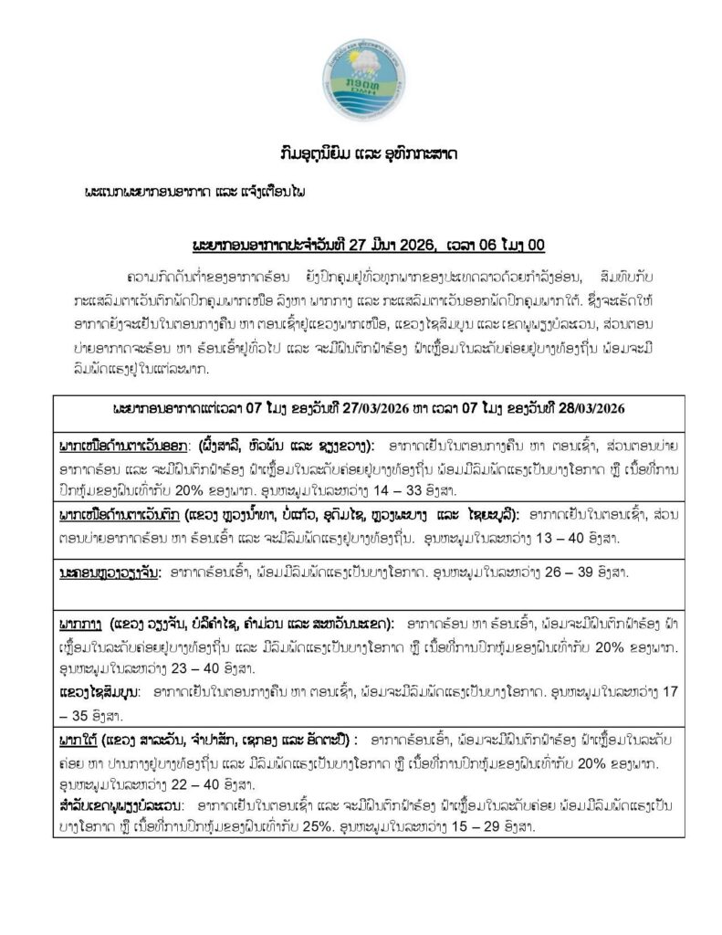 ລາຍງານສະພາບອາກາດປະຈໍາວັນທີ 27 ມີນາ 2026