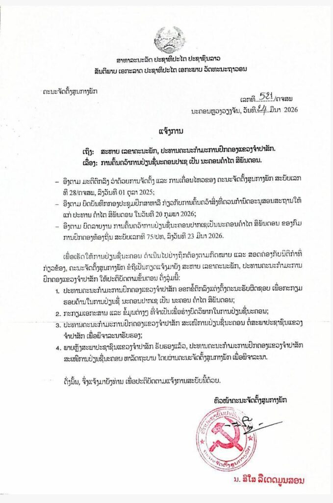 ອີງຕາມແຈ້ງການຂອງຄະນະຈັດຕັ້ງສູນກາງພັກ ເລກທີ 521/ຄຈສພ ນະຄອນຫຼວງວຽງຈັນ, ລົງວັນທີ 24 ມີນາ 2026