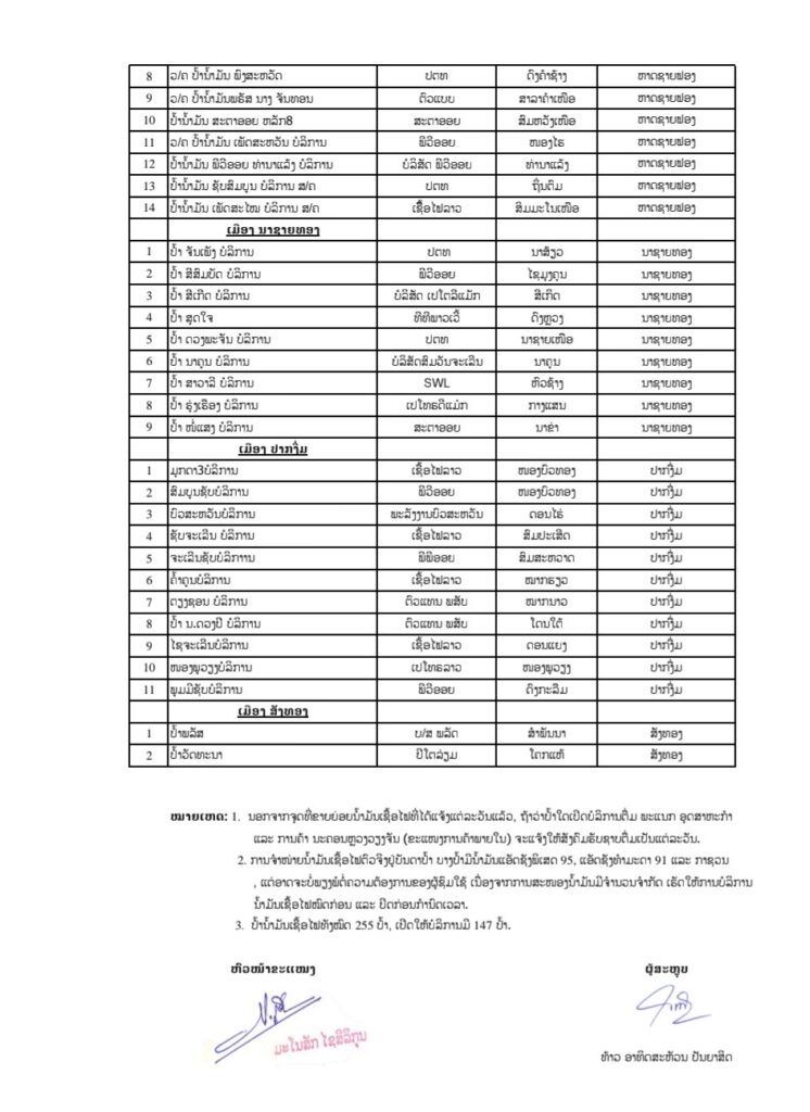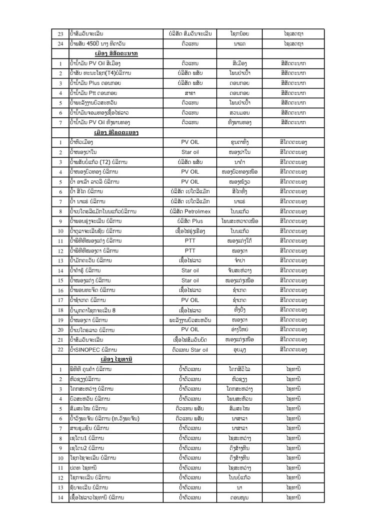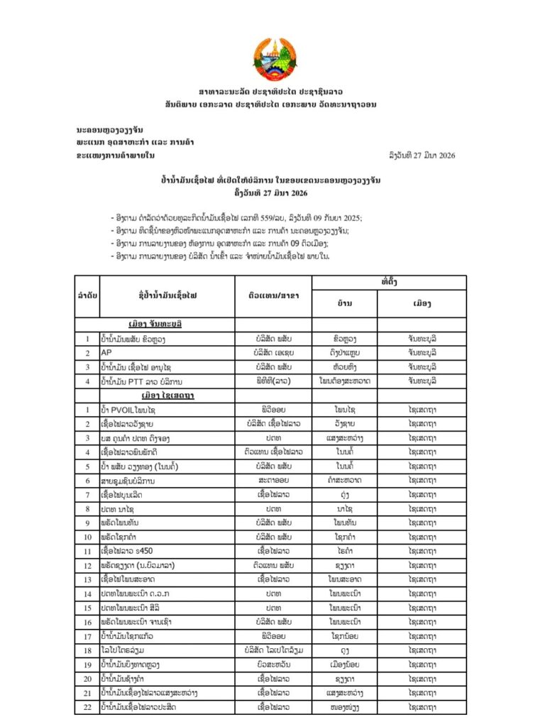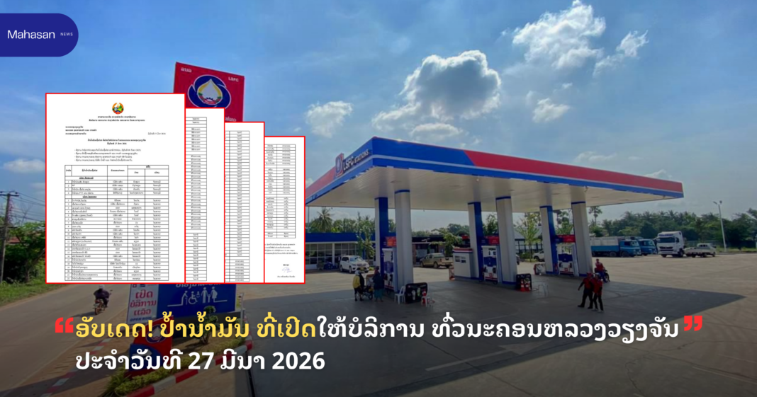 ແຈ້ງການ ອັບເດດ! ປໍ້ານໍ້າມັນ ທີ່ເປີດໃຫ້ບໍລິການ ທົ່ວນະຄອນຫລວງວຽງຈັນ ປະຈຳວັນທີ 27 ມີນາ 2026 By Jenjila ທີ 27 March, 2026 0 323 Share FacebookTwitterPinterestWhatsApp Must read ເມື່ອພີ່ດື້ຊ້າງປ່າແຫ່ງອຸທິຍານແຫ່ງຊາດເຂົາໃຫຍ່ແຂກໂຕນ້ອຍຢາກກິນຕຳບັກຫຸ່ງ… ຄວາມວຸ່ນວາຍທີ່ໜ້າຮັກຈຶ່ງເກີດຂຶ້ນ! ທີ 3 April, 2026 M moneyX ຮ່ວມມືກັບ Visa ເພື່ອເປີດທົດລອງບັດ VISA Prepaid Card ແລະ ພັດທະນາ Visa Pay ເພື່ອການຊຳລະເງິນດິຈິຕອນໃນລາວ ເເລະ ສາກົນ ທີ 3 April, 2026 ຈີນ ຮຽກຮ້ອງທົ່ວໂລກຮ່ວມມື ປາບປາມການສໍ້ໂກງ ທາງຄົມມະນາຄົມ-ອາຊະຍາກຳໄຊເບີຣ ທີ 3 April, 2026 ແຈ້ງການມອດໄຟ ວັນທີ 04,05/04/2026 ທີ 3 April, 2026 Jenjila ອັບເດດ! ປໍ້ານໍ້າມັນ ທີ່ເປີດໃຫ້ບໍລິການ ທົ່ວນະຄອນຫລວງວຽງຈັນ ວັນທີ 27 ມີນາ 2026 ດັ່ງລຸາ Share FacebookTwitterPinterestWhatsApp Previous articleຄະນະຈັດຕັ້ງສູນກາງພັກ ສະເໜີຄົ້ນຄວ້າ ການປ່ຽນຊື່ນະຄອນປາກເຊ ເປັນຊື່ນະຄອນຄໍາໄຕສີພັນດອນ.Next articleສຳເລັດການທຳລາຍລະເບີດໃຫຍ່ MK82 ນ້ຳໜັກ 500 ປອນ ບ້ານພິກໃຫຍ່ຂອງໂຄງການເກັບກູ້ລະເບີດແຫ່ງຊາດ ປະຈໍາ ແຂວງ ຫລວງພະບາງ More articles ແຈ້ງການມອດໄຟ ວັນທີ 04,05/04/2026 ທີ 3 April, 2026 ແຈ້ງການມອດໄຟ ວັນທີ 3/4/2026 ບ້ານ ໂພນຕ້ອງສະຫວາດ ເມືອງ ຈັນທະບູລີ ທີ 2 April, 2026 ແຈ້ງການ ກົມການຄ້າພາຍໃນ ກະຊວງ ອຸດສາຫະກຳ ແລະ ການຄ້າ ທີ 1 April, 2026 LEAVE A REPLY Cancel reply Comment: Please enter your comment! Name:* Please enter your name here Email:* You have entered an incorrect email address! Please enter your email address here Website: Save my name, email, and website in this browser for the next time I comment. - Advertisement - Latest article ເມື່ອພີ່ດື້ຊ້າງປ່າແຫ່ງອຸທິຍານແຫ່ງຊາດເຂົາໃຫຍ່ແຂກໂຕນ້ອຍຢາກກິນຕຳບັກຫຸ່ງ… ຄວາມວຸ່ນວາຍທີ່ໜ້າຮັກຈຶ່ງເກີດຂຶ້ນ! ທີ 3 April, 2026 M moneyX ຮ່ວມມືກັບ Visa ເພື່ອເປີດທົດລອງບັດ VISA Prepaid Card ແລະ ພັດທະນາ Visa Pay ເພື່ອການຊຳລະເງິນດິຈິຕອນໃນລາວ ເເລະ ສາກົນ ທີ 3 April, 2026 ຈີນ ຮຽກຮ້ອງທົ່ວໂລກຮ່ວມມື ປາບປາມການສໍ້ໂກງ ທາງຄົມມະນາຄົມ-ອາຊະຍາກຳໄຊເບີຣ ທີ 3 April, 2026 ແຈ້ງການມອດໄຟ ວັນທີ 04,05/04/2026 ທີ 3 April, 2026 ລາຍງານສະພາບອາກາດປະຈໍາວັນທີ 03 ເມສາ 2026 ທີ 3 April, 2026