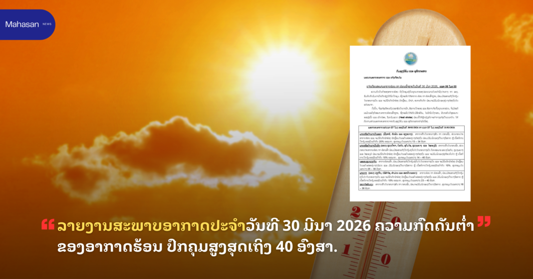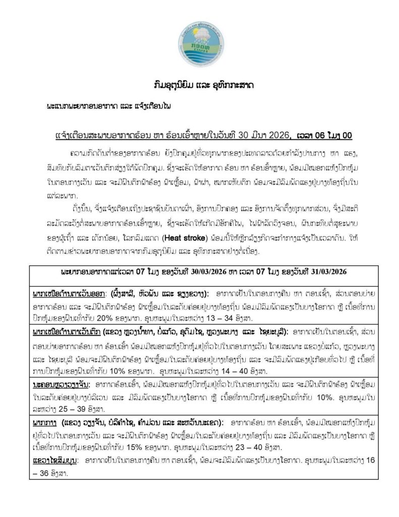 ອາກາດຮ້ອນເອົົ້າຫລາຍ ໃນເຊົ້າວັນທີ 30 ມີນາ 2026 ຄວາມກົດດັນຕ່ຳຂອງອາກາດຮ້ອນ ຍັງປົກຄຸມຢູ່ທົົ່ວທຸກພາກຂອງປະເທດລາວ ດ້ວຍກຳລັງປານກາງ ຫາ ແຮງ, ສົມທົບກັບລົມຕາເວັນຕົກສ່ຽງໃຕ້ພັດປົກຄຸມ. ເຊິ່ງຈະເຮັດໃຫ້ອາກາດຮ້ອນ ຫາ ຮ້ອນເອົົ້າຫລາຍ, ພ້ອມມີໝອກແຫ້ງປົກຫຸ້ມໃນຕອນກາງເວັນ ແລະ ຈະມີຝົນຕົກ ຟ້າຮ້ອງ ຟ້າເຫລື້ອມ, ຟ້າຜ່າ, ໝາກເຫັບຕົກ ພ້ອມຈະມີລົມພັດແຮງຢູ່ບາງທ້ອງຖິ່ນໃນແຕ່ລະພາກ.