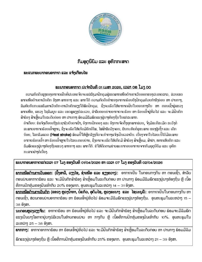 ພະຍາກອນອາກາດ ແຕ່ເວລາ 07 ໂມງ ຂອງວັນທີ 01/04/2026 ຫາ ເວລາ 07 ໂມງ ຂອງວັນທີ 02/04/2026