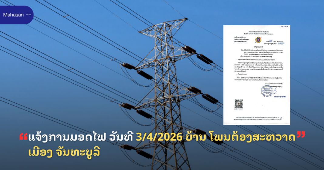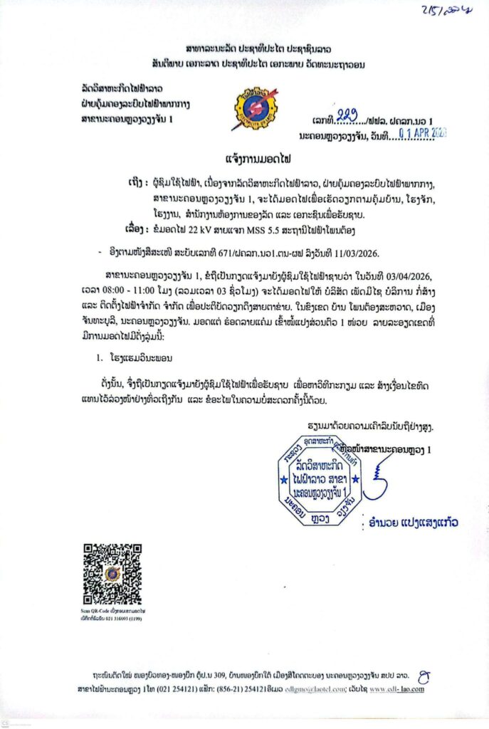 ແຈ້ງການມອດໄຟ ວັນທີ 3/4/2026 ບ້ານ ໂພນຕ້ອງສະຫວາດ ເມືອງ ຈັນທະບູລີ