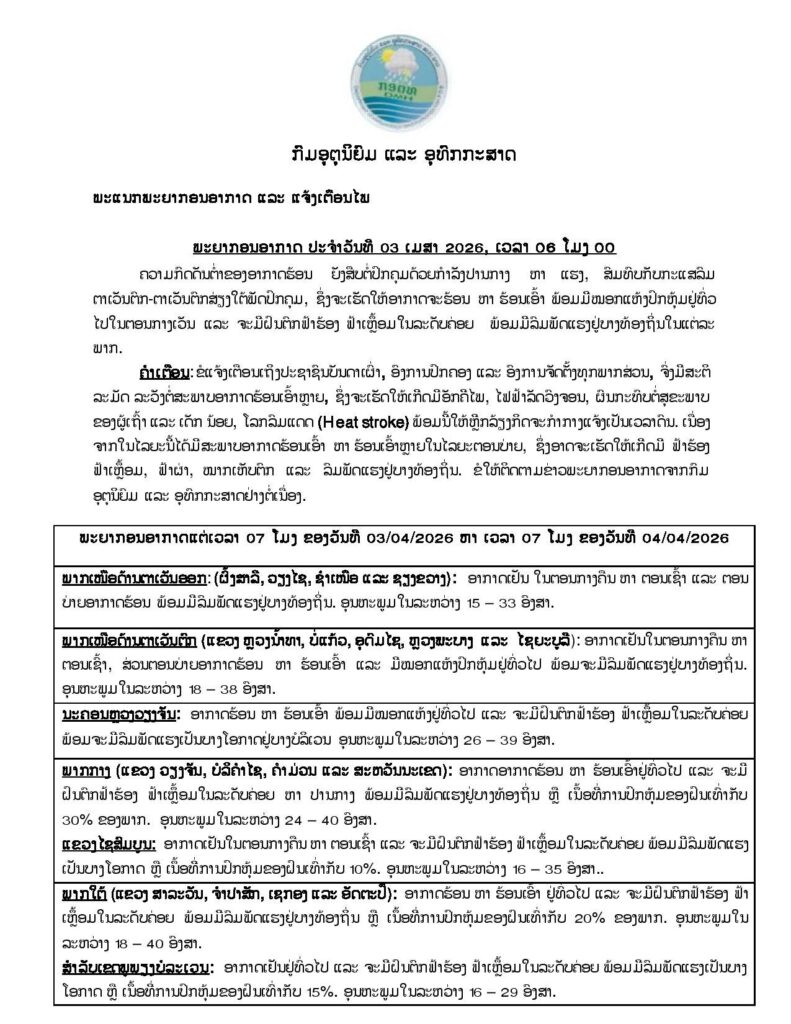 ລະມັດລະວັງຕໍ່ສະພາບອາກາດຮ້ອນເອົ້າຫລາຍ, ຊຶ່ງຈະເຮັດໃຫ້ເກີດມີອັກຄີໄພ, ໄຟຟ້າລັດວົງຈອນ, ຜົນກະທົບຕໍ່ສຸຂະພາບຂອງຜູ້ເຖົ້າ ແລະ ເດັກນ້ອຍ, ໂລກລົມແດດ (Heat stroke) ພ້ອມນີ້ໃຫ້ຫລີກລ່ຽງກິດຈະກໍາກາງແຈ້ງເປັນເວລາດົນ. ເນື່ອງຈາກໃນໄລຍະນີ້ໄດ້ມີສະພາບອາກາດຮ້ອນເອົ້າ ຫາ ຮ້ອນເອົ້າຫລາຍໃນໄລຍະຕອນບ່າຍ, ຊຶ່ງອາດຈະເຮັດໃຫ້ເກີດມີຟ້າຮ້ອງ ຟ້າເຫລື້ອມ, ຟ້າຜ່າ, ໝາກເຫັບຕົກ ແລະ ລົມພັດແຮງຢູ່ບາງທ້ອງຖິ່ນ. ຂໍໃຫ້ຕິດຕາມຂ່າວພະຍາກອນອາກາດ ຈາກກົມອຸຕຸນິຍົມ ແລະ ອຸທົກກະສາດ ຢໍ່າງຕໍ່ເນື່ອງ.