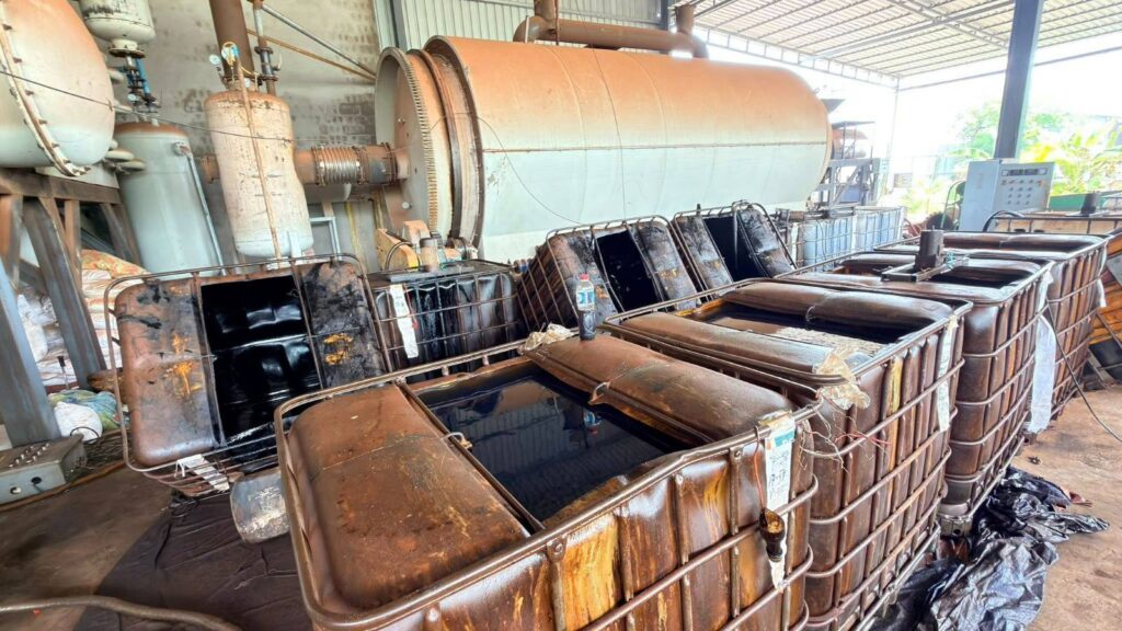 ຜ່ານກວດກາຕົວຈິງພົບວ່າ: ໂຮງງານດັ່ງກ່າວໄດ້ມີການຕິດຕັ້ງເຄື່ອງຈັກ ເພື່ອບົດຂີ້ເຫຍື້ອພລາສຕິກ ແລະ ກັ່ນນ້ຳມັນເຄື່ອງເກົ່າ ເພື່ອຜະລິດເປັນນ້ຳມັນເຊື້ອໄຟ ໂດຍບໍ່ມີໃບອະນຸຍາດດຳເນີນທຸລະກິດ, ບໍ່ໄດ້ຜ່ານການກວດກາຢັ້ງຢືນຄຸນນະພາບ ແລະ ບໍ່ໄດ້ເສຍພາສີ-ອາກອນຕາມລະບຽບກົດໝາຍ. ນອກນັ້ນ, ໃນສະຖານທີ່ດັ່ງກ່າວ ຍັງພົບນ້ຳມັນທີ່ຜະລິດສຳເລັດຮູບແລ້ວຈຳນວນຫຼວງຫຼາຍທີ່ກຽມຈະນຳໄປຈຳໜ່າຍ ຕາມປ້ຳນ້ຳມັນທົ່ວໄປ.