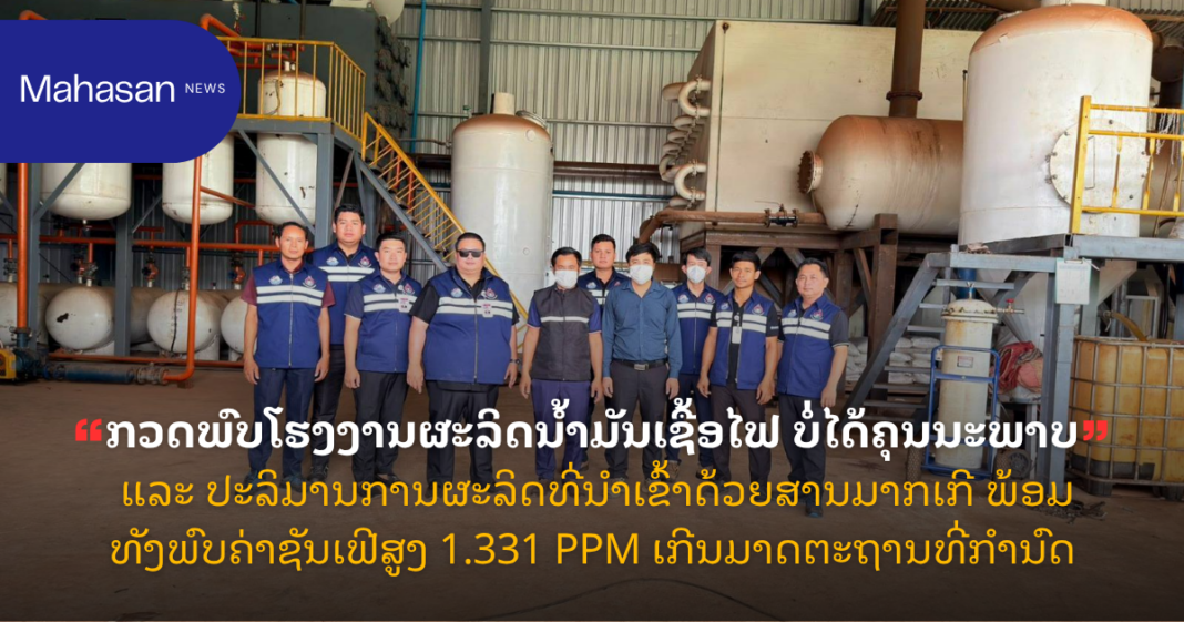 ເມື່ອວັນທີ 4 ເມສາ 2026, ຄະນະຮັບຜິດຊອບຄຸ້ມຄອງຄຸນນະພາບນ້ຳມັນເຊື້ອໄຟ ພ້ອມດ້ວຍຫ້ອງກວດກາຄຸນນະພາບ ແລະ ຄຸ້ມຄອງບໍລິມາດນ້ຳມັນ (ກົມມາດຕະຖານ ແລະ ວັດແທກ) ໄດ້ລົງກວດກາ ໂຮງງານເປົ້າໝາຍແຫ່ງໜຶ່ງຢູ່ເຂດເສັ້ນທາງເລກທີ 13 ໃຕ້ ນະຄອນຫຼວງວຽງຈັນ ທີ່ສົງໄສວ່າເປັນແຫຼ່ງ ຜະລິດນ້ຳມັນບໍ່ໄດ້ມາດຕະຖານ.