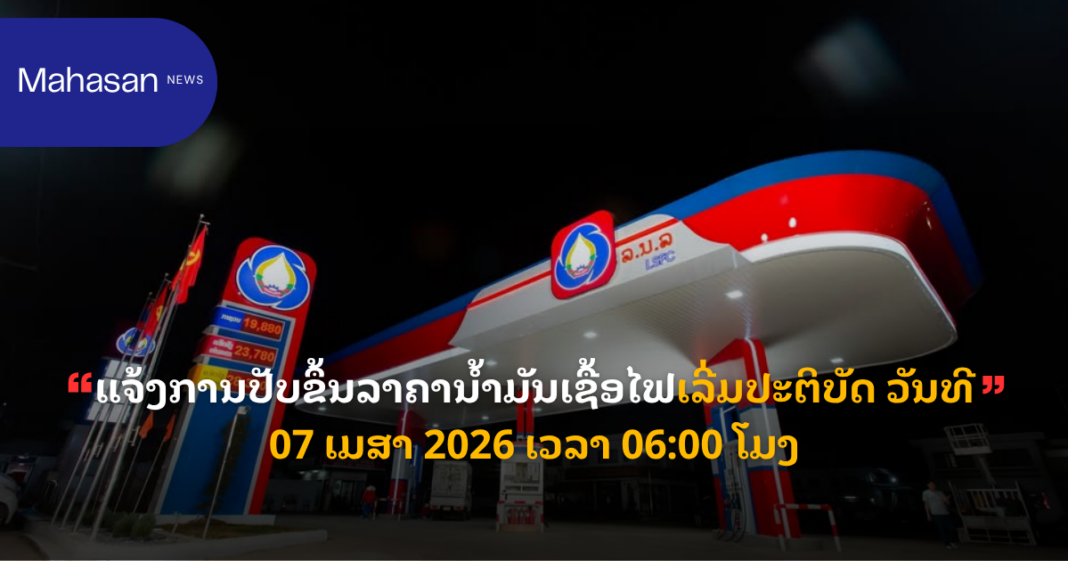 ແຈ້ງ​ການປັບ​​ຂຶ້ນ​ລາ​ຄາ​ນ້ຳ​ມັນ​ເຊື້ອ​ໄຟ​ໃນ​ຂອບ​ເຂດ​ທົ່ວ​ປະ​ເທດເລີ່ມ​ປະ​ຕິ​ບັດ ວັນ​ທີ 07 ເມ​ສາ 2026 ເວ​ລາ 06:00 ໂມງ