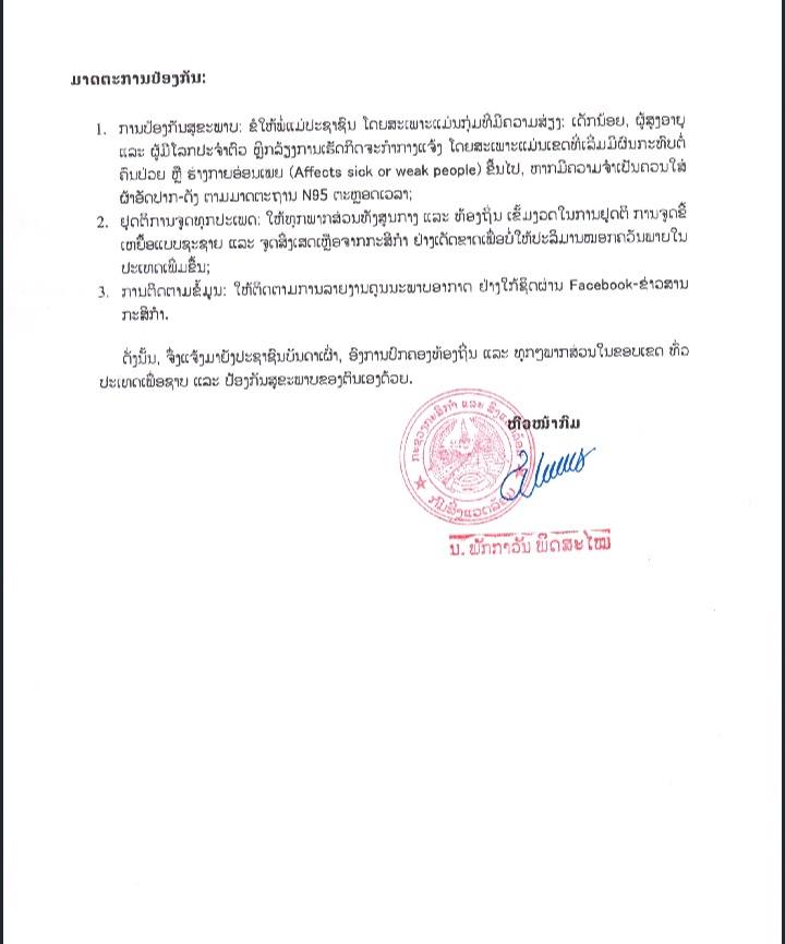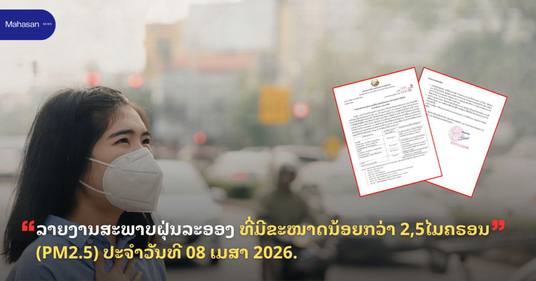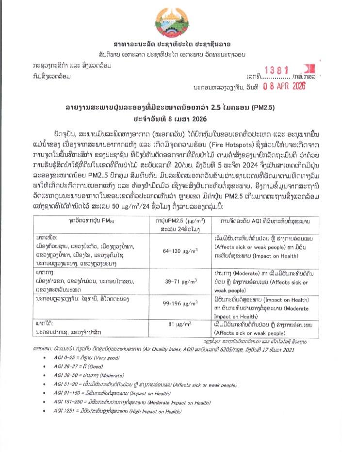 ແຈ້ງການ ລາຍງານສະພາບຝຸ່ນລະອອງ ທີ່ມີຂະໜາດນ້ອຍກວ່າ 2,5ໄມຄຣອນ (PM2.5) ປະຈຳວັນທີ 08 ເມສາ 2026. By Jenjila ທີ 8 April, 2026 0 11 Share FacebookXPinterestWhatsApp Must read ແຈ້ງການມອດໄຟ ວັນທີ 11 ແລະ 12 ເມສາ 2026 ທີ 10 April, 2026 ເຈົ້າໜ້າທີ່ ຈັບຕົວຜູ້ຄ້າຂາຍຢາເສບຕິດ 3 ຄົນ ພ້ອມຂອງກາງ ແລະ ອາວຸດປືນ ທີ 10 April, 2026 ປັດຈຸບັນ ວິສາຫະກິດ ຫວຽດນາມ ລົງທຶນ ຢູ່ ລາວ ທັງໝົດ 276 ໂຄງການ ທີ 10 April, 2026 ເລຂາທິການໃຫຍ່ພັກ ປປ ລາວ ຕ້ອນຮັບ ຜູ້ປະຈໍາການຄະນະເລຂາທິການສູນກາງພັກກອມມູນິດຫວຽດນາມ ທີ 10 April, 2026 Jenjila ລາຍລະອຽດຕາມໃບແຈ້ງການດັ່ງລູ່ມນີ້: ຂໍ້ມູນ: ກົມສີ່ງແວດລ້ອມ. Share FacebookXPinterestWhatsApp Previous articleເປີດລາຍລະອຽດ 10 ຂໍ້ສະເໜີຂອງອີຣ່ານ ເງື່ອນໄຂຂໍ້ຕົກລົງຢຸດຍິງກັບສະຫະລັດ-ອິສຣາເອວ 2 ອາທິດNext articleສິງກະໂປລັ່ນບໍ່ເຈລະຈາຂໍອິຣ່ານຜ່ານຊ່ອງແຄບຮໍມຸຊ ຊີ້ມີສິດໃນການເດີນເຮືອຢູ່ແລ້ວ More articles ແຈ້ງການມອດໄຟ ວັນທີ 11 ແລະ 12 ເມສາ 2026 ທີ 10 April, 2026 ເເຈ້ງປັບລົງລາຄານ້ຳມັນເຊື້ອໄຟໃນຂອບເຂດທົ່ວປະເທດ ທີ 9 April, 2026 ແຈ້ງການມອດໄຟ ວັນທີ 9,10,11/4/2026 ເມືອງ ໄຊເສດຖາ, ເມືອງ ສີໂຄດຕະບອງ ທີ 8 April, 2026 LEAVE A REPLY Cancel reply Comment: Please enter your comment! Name:* Please enter your name here Email:* You have entered an incorrect email address! Please enter your email address here Website: Save my name, email, and website in this browser for the next time I comment. - Advertisement - Latest article ແຈ້ງການມອດໄຟ ວັນທີ 11 ແລະ 12 ເມສາ 2026 ທີ 10 April, 2026 ເຈົ້າໜ້າທີ່ ຈັບຕົວຜູ້ຄ້າຂາຍຢາເສບຕິດ 3 ຄົນ ພ້ອມຂອງກາງ ແລະ ອາວຸດປືນ ທີ 10 April, 2026 ປັດຈຸບັນ ວິສາຫະກິດ ຫວຽດນາມ ລົງທຶນ ຢູ່ ລາວ ທັງໝົດ 276 ໂຄງການ ທີ 10 April, 2026 ເລຂາທິການໃຫຍ່ພັກ ປປ ລາວ ຕ້ອນຮັບ ຜູ້ປະຈໍາການຄະນະເລຂາທິການສູນກາງພັກກອມມູນິດຫວຽດນາມ ທີ 10 April, 2026 ທຣໍາ ເຕືອນ ອີຣ່ານ ຫ້າມເກັບຄ່າຜ່ານທາງເຮືອບັນທຸກນ້ຳມັນໃນຊ່ອງແຄບຮໍມຸດ ທີ 10 April, 2026