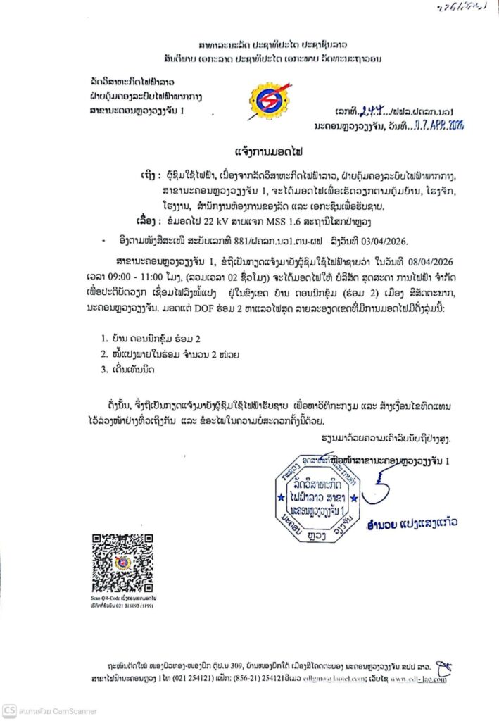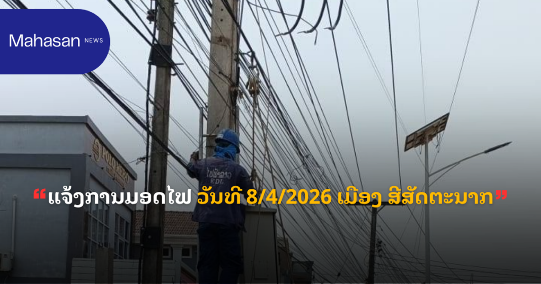 ແຈ້ງການ ແຈ້ງການມອດໄຟ ວັນທີ 8/4/2026 ເມືອງ ສີສັດຕະນາກ By Pele ທີ 8 April, 2026 0 70 Share FacebookXPinterestWhatsApp Must read ແຈ້ງການມອດໄຟ ວັນທີ 11 ແລະ 12 ເມສາ 2026 ທີ 10 April, 2026 ເຈົ້າໜ້າທີ່ ຈັບຕົວຜູ້ຄ້າຂາຍຢາເສບຕິດ 3 ຄົນ ພ້ອມຂອງກາງ ແລະ ອາວຸດປືນ ທີ 10 April, 2026 ປັດຈຸບັນ ວິສາຫະກິດ ຫວຽດນາມ ລົງທຶນ ຢູ່ ລາວ ທັງໝົດ 276 ໂຄງການ ທີ 10 April, 2026 ເລຂາທິການໃຫຍ່ພັກ ປປ ລາວ ຕ້ອນຮັບ ຜູ້ປະຈໍາການຄະນະເລຂາທິການສູນກາງພັກກອມມູນິດຫວຽດນາມ ທີ 10 April, 2026 Pele ທີ່ມາ:EDL LAOS ລັດວິສາຫະກິດໄຟຟ້າລາວ ສາຂານະຄອນຫຼວງ1 Share FacebookXPinterestWhatsApp Previous articleລາຍງານສະພາບອາກາດປະຈໍາວັນທີ 8 ເມສາ 2026Next articleເປີດລາຍລະອຽດ 10 ຂໍ້ສະເໜີຂອງອີຣ່ານ ເງື່ອນໄຂຂໍ້ຕົກລົງຢຸດຍິງກັບສະຫະລັດ-ອິສຣາເອວ 2 ອາທິດ More articles ແຈ້ງການມອດໄຟ ວັນທີ 11 ແລະ 12 ເມສາ 2026 ທີ 10 April, 2026 ເເຈ້ງປັບລົງລາຄານ້ຳມັນເຊື້ອໄຟໃນຂອບເຂດທົ່ວປະເທດ ທີ 9 April, 2026 ແຈ້ງການມອດໄຟ ວັນທີ 9,10,11/4/2026 ເມືອງ ໄຊເສດຖາ, ເມືອງ ສີໂຄດຕະບອງ ທີ 8 April, 2026 LEAVE A REPLY Cancel reply Comment: Please enter your comment! Name:* Please enter your name here Email:* You have entered an incorrect email address! Please enter your email address here Website: Save my name, email, and website in this browser for the next time I comment. - Advertisement - Latest article ແຈ້ງການມອດໄຟ ວັນທີ 11 ແລະ 12 ເມສາ 2026 ທີ 10 April, 2026 ເຈົ້າໜ້າທີ່ ຈັບຕົວຜູ້ຄ້າຂາຍຢາເສບຕິດ 3 ຄົນ ພ້ອມຂອງກາງ ແລະ ອາວຸດປືນ ທີ 10 April, 2026 ປັດຈຸບັນ ວິສາຫະກິດ ຫວຽດນາມ ລົງທຶນ ຢູ່ ລາວ ທັງໝົດ 276 ໂຄງການ ທີ 10 April, 2026 ເລຂາທິການໃຫຍ່ພັກ ປປ ລາວ ຕ້ອນຮັບ ຜູ້ປະຈໍາການຄະນະເລຂາທິການສູນກາງພັກກອມມູນິດຫວຽດນາມ ທີ 10 April, 2026 ທຣໍາ ເຕືອນ ອີຣ່ານ ຫ້າມເກັບຄ່າຜ່ານທາງເຮືອບັນທຸກນ້ຳມັນໃນຊ່ອງແຄບຮໍມຸດ ທີ 10 April, 2026