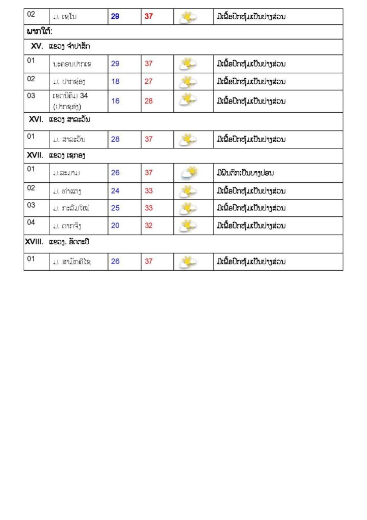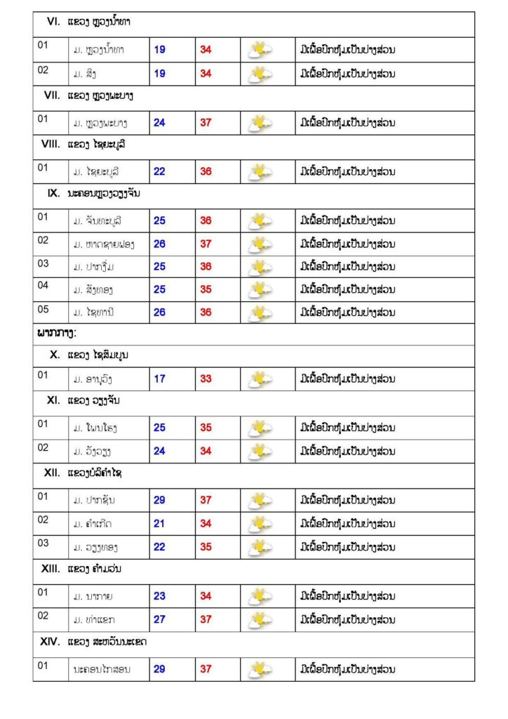 ລັກສະນະອາກາດ: ອາກາດຮ້ອນເອົ້າ ຫາ ຮ້ອນຈັດ, ມີຟ້າເຫຼື້ອມ ແລະ ຝົນຕົກຟ້າຮ້ອງກະຈາຍໃນບາງເຂດ.