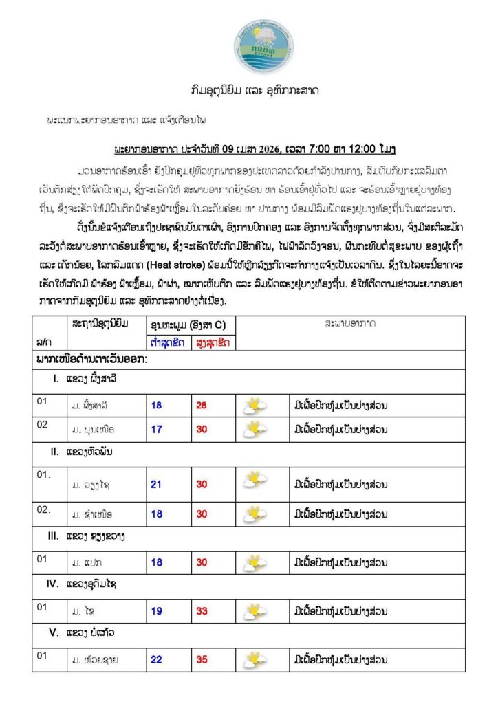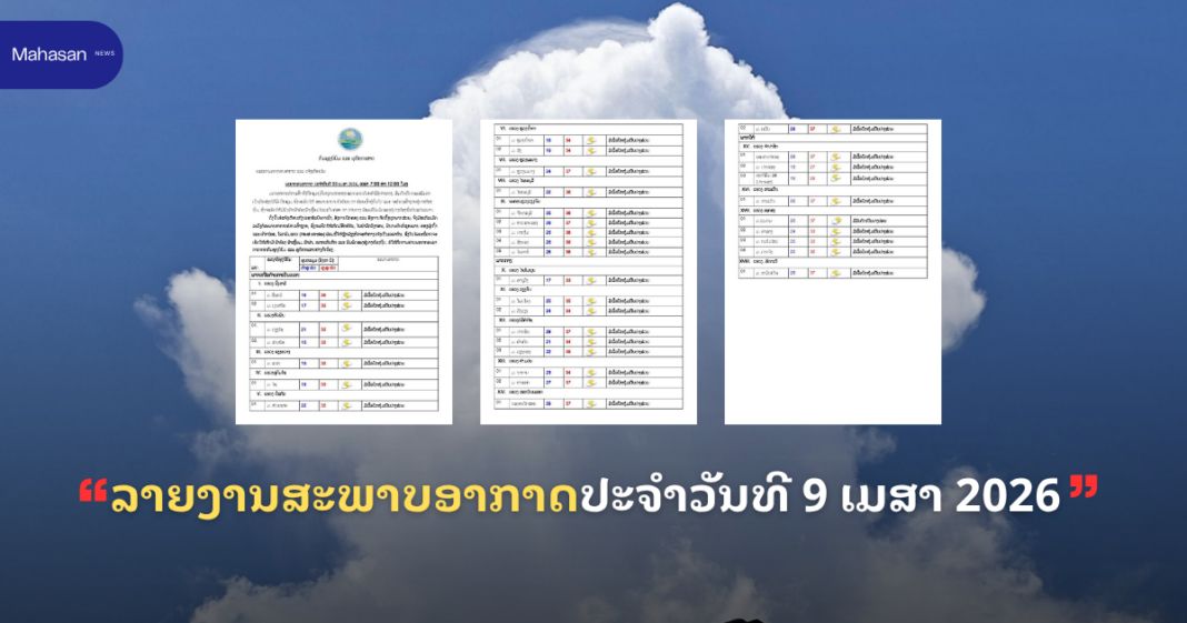 ລາຍງານສະພາບອາກາດປະຈໍາວັນທີ 9 ເມສາ 2026