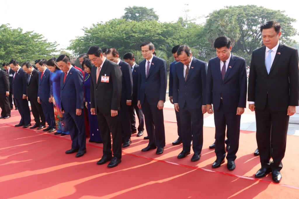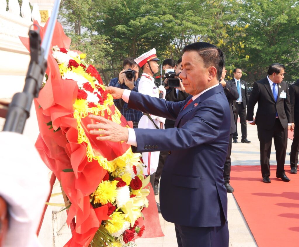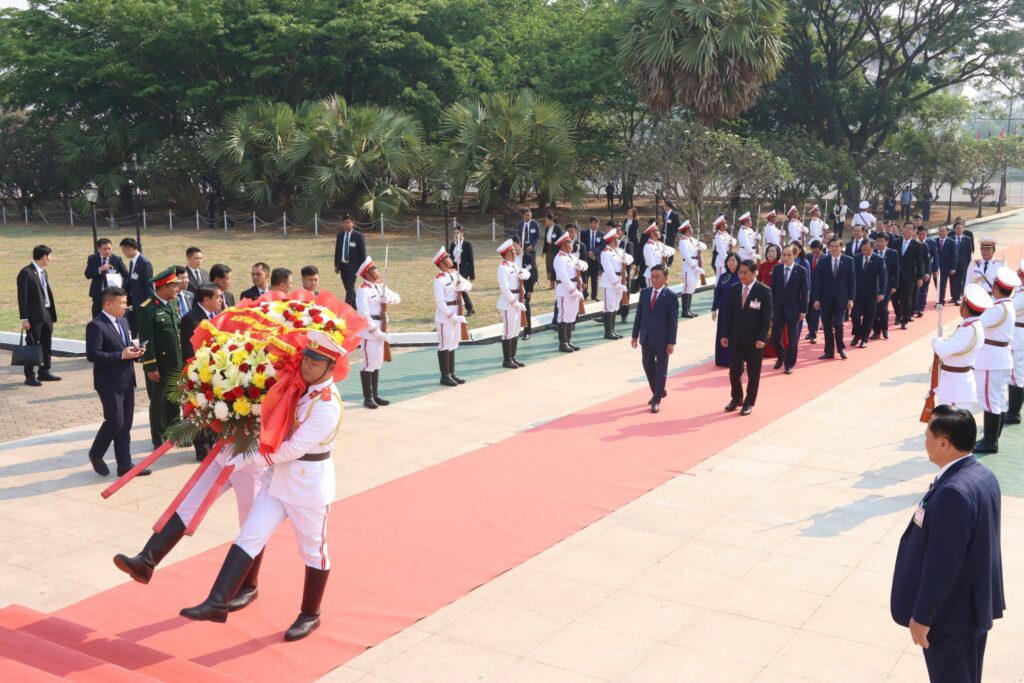 ພາຍຫລັງເດີນທາງມາເຖິງ ສະໜາມບິນສາກົນວັດໄຕ ສະຫາຍ ເຈີນ ເກີ້ມ ຕູ໊ ພ້ອມດ້ວຍຄະນະຜູ້ແທນຂັ້ນສູງ ພັກ, ລັດ ສສ ຫວຽດນາມ ກໍໄດ້ເດີນທາງໄປວາງພວງມະລາ ຢູ່ອະນຸສາວະລີນັກຮົບນິລະນາມ(ດາວແດງ) ນະຄອນຫລວງວຽງຈັນ ເພື່ອເປັນການສະແດງເຖິງ ຄວາມເຄົາລົບຮັກ, ຄວາມກະຕັນຍູຮູ້ບຸນຄຸນ ແລະ ຄຸນງາມ ຄວາມດີ, ນ້ຳໃຈຕໍ່ສູ້ຢ່າງພິລະອາດຫານ ແລະ ບໍ່ຍອມຈຳນົນຂອງບັນພະບູລຸດລາວ ກໍຄື ບັນດານັກຮົບປະຕິວັດຂອງລາວ ທີ່ເສຍສະລະຊີວິດ, ເລືອດເນື້ອເພື່ອພາລະກິດປະຕິວັດ ຢ່າງອົງອາດກ້າຫານພາຍໃຕ້ການນໍາພາ-ຊີ້ນຳຂອງ ພັກປະຊາຊົນ ປະຕິວັດລາວ ຈົນສາມາດຍາດໄດ້ ໄຊຊະນະ ແລະ ປະກາດເອກະລາດ, ສະຖາປະນາ ເປັນສາທາລະນະລັດ ປະຊາທິປະໄຕ ປະຊາຊົນລາວ ຂຶ້ນຢ່າງສະຫງ່າຜ່າເຜີຍ ໃນວັນທີ 2 ທັນວາ 1975.