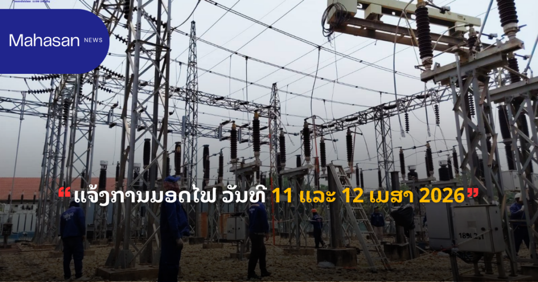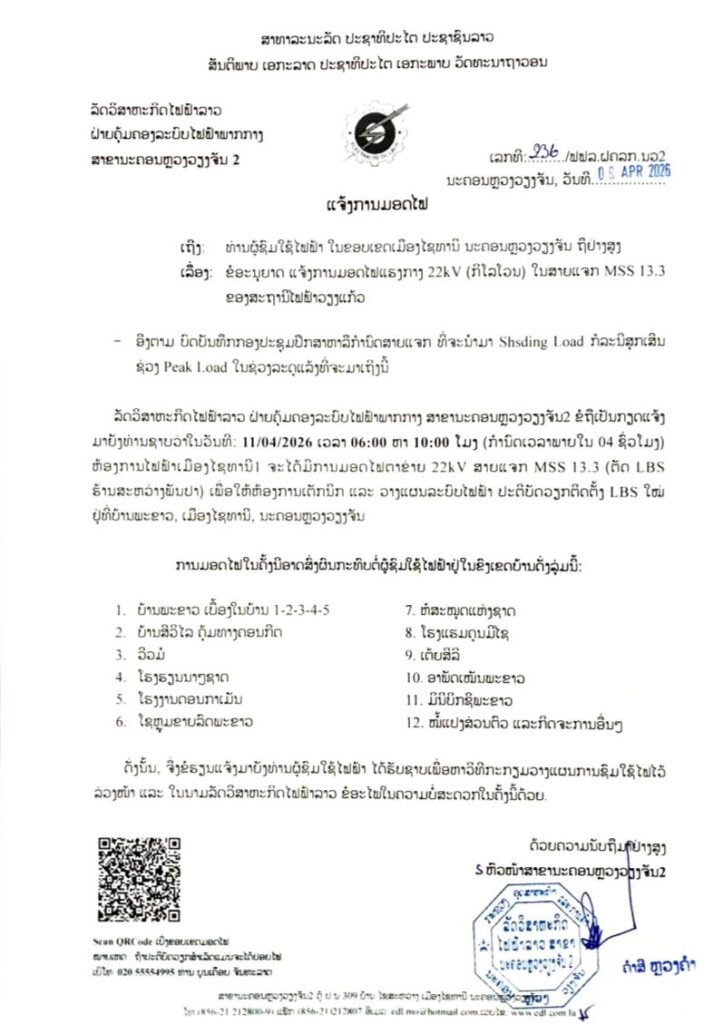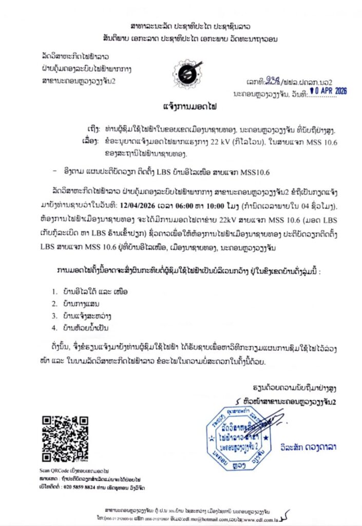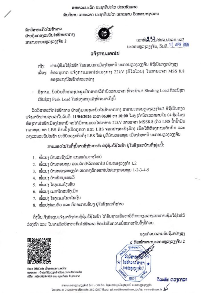 ແຈ້ງການ ແຈ້ງການມອດໄຟ ວັນທີ 11 ແລະ 12 ເມສາ 2026 By Pele ທີ 10 April, 2026 0 702 Share FacebookXPinterestWhatsApp Must read ເຈົ້າໜ້າທີ່ ຈັບຕົວຜູ້ຄ້າຂາຍຢາເສບຕິດ 3 ຄົນ ພ້ອມຂອງກາງ ແລະ ອາວຸດປືນ ທີ 10 April, 2026 ປັດຈຸບັນ ວິສາຫະກິດ ຫວຽດນາມ ລົງທຶນ ຢູ່ ລາວ ທັງໝົດ 276 ໂຄງການ ທີ 10 April, 2026 ເລຂາທິການໃຫຍ່ພັກ ປປ ລາວ ຕ້ອນຮັບ ຜູ້ປະຈໍາການຄະນະເລຂາທິການສູນກາງພັກກອມມູນິດຫວຽດນາມ ທີ 10 April, 2026 ທຣໍາ ເຕືອນ ອີຣ່ານ ຫ້າມເກັບຄ່າຜ່ານທາງເຮືອບັນທຸກນ້ຳມັນໃນຊ່ອງແຄບຮໍມຸດ ທີ 10 April, 2026 Pele ທີ່:ລັດວິສາຫະກິດໄຟຟ້າລາວ ສາຂານະຄອນຫລວງ2 Share FacebookXPinterestWhatsApp Previous articleເຈົ້າໜ້າທີ່ ຈັບຕົວຜູ້ຄ້າຂາຍຢາເສບຕິດ 3 ຄົນ ພ້ອມຂອງກາງ ແລະ ອາວຸດປືນ More articles ເເຈ້ງປັບລົງລາຄານ້ຳມັນເຊື້ອໄຟໃນຂອບເຂດທົ່ວປະເທດ ທີ 9 April, 2026 ແຈ້ງການມອດໄຟ ວັນທີ 9,10,11/4/2026 ເມືອງ ໄຊເສດຖາ, ເມືອງ ສີໂຄດຕະບອງ ທີ 8 April, 2026 ແຈ້ງການມອດໄຟ ວັນທີ 10 ເມສາ 2026 ທີ 8 April, 2026 LEAVE A REPLY Cancel reply Comment: Please enter your comment! Name:* Please enter your name here Email:* You have entered an incorrect email address! Please enter your email address here Website: Save my name, email, and website in this browser for the next time I comment. - Advertisement - Latest article ເຈົ້າໜ້າທີ່ ຈັບຕົວຜູ້ຄ້າຂາຍຢາເສບຕິດ 3 ຄົນ ພ້ອມຂອງກາງ ແລະ ອາວຸດປືນ ທີ 10 April, 2026 ປັດຈຸບັນ ວິສາຫະກິດ ຫວຽດນາມ ລົງທຶນ ຢູ່ ລາວ ທັງໝົດ 276 ໂຄງການ ທີ 10 April, 2026 ເລຂາທິການໃຫຍ່ພັກ ປປ ລາວ ຕ້ອນຮັບ ຜູ້ປະຈໍາການຄະນະເລຂາທິການສູນກາງພັກກອມມູນິດຫວຽດນາມ ທີ 10 April, 2026 ທຣໍາ ເຕືອນ ອີຣ່ານ ຫ້າມເກັບຄ່າຜ່ານທາງເຮືອບັນທຸກນ້ຳມັນໃນຊ່ອງແຄບຮໍມຸດ ທີ 10 April, 2026 ແຫລ່ງທ່ອງທ່ຽວນໍ້າຕົກຕາດເຍືອງ ມີຄວາມພ້ອມຕ້ອນຮັບແຂກ ທີ່ຈະມາທ່ອງທ່ຽວ ໄລຍະບຸນປີໃໝ່ລາວ ພສ 2569 ທີ 10 April, 2026