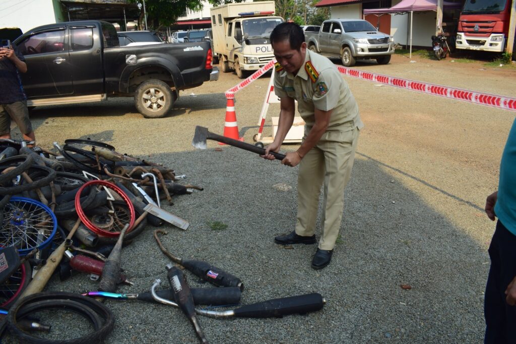 ວັນທີ 10 ເມສາ 2026 ພະແນະຈາລາຈອນຫ້ອງຕໍາຫລວດ ກອງບັນຊາການ ປກສ ແຂວງບໍ່ແກ້ວ ໄດ້ສົມທົບກັບພະແນກ ໂຍທາທິການ ແລະ ຂົນສົ່ງ ແຂວງບໍ່ແກ້ວ ຈັດພິທີທໍາລາຍປ້າຍ ແລະ ສິ້ນສ່ວນດັດແປງສະພາບເຕັກນິກ ຜິດລະບຽບການສັນຈອນທາງບົກ ທີ່ພະແນກຈະລາຈອນສາມາດກັກໄດ້ ແລະ ນຳມາທຳລາຍຄັ້ງນີ້ມີ: