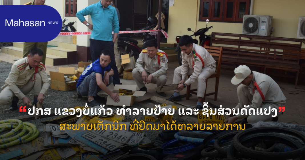 ວັນທີ 10 ເມສາ 2026 ພະແນະຈາລາຈອນຫ້ອງຕໍາຫລວດ ກອງບັນຊາການ ປກສ ແຂວງບໍ່ແກ້ວ ໄດ້ສົມທົບກັບພະແນກ ໂຍທາທິການ ແລະ ຂົນສົ່ງ ແຂວງບໍ່ແກ້ວ ຈັດພິທີທໍາລາຍປ້າຍ ແລະ ສິ້ນສ່ວນດັດແປງສະພາບເຕັກນິກ ຜິດລະບຽບການສັນຈອນທາງບົກ ທີ່ພະແນກຈະລາຈອນສາມາດກັກໄດ້ ແລະ ນຳມາທຳລາຍຄັ້ງນີ້ມີ: