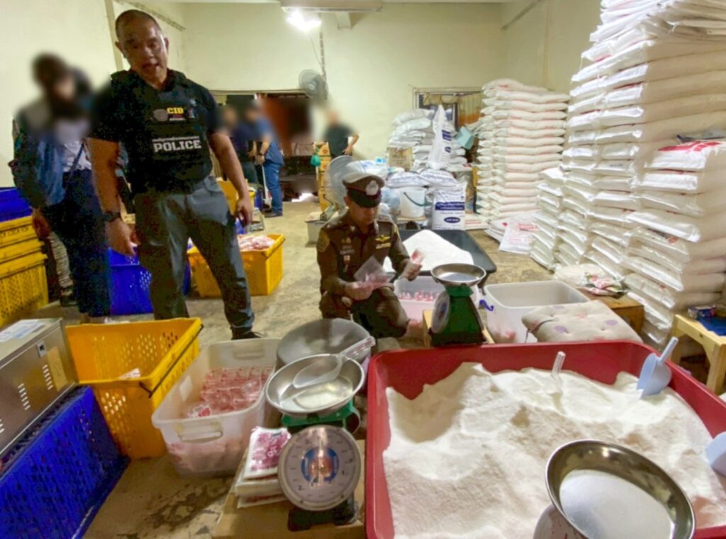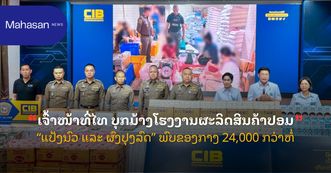 ສໍານັກຂ່າວສົດໄທລາຍງານ ວັນທີ 17 ເມສາ 2026 ນີ້ວ່າ: ເຈົ້າໜ້າທີ່ຕຳຫລວດສອບສວນກາງ (CIB) ຮ່ວມກັບ ສຳນັກງານຄະນະກຳມະການອາຫານ ແລະ ຢາ (ອຢ) ເປີດປະຕິບັດການ “Take Down” ເພື່ອມ້າງເຄືອຂ່າຍຜະລິດສິນຄ້າປອມລາຍໃຫຍ່ ປະເພດແປ້ງນົວ ແລະ ຜົງປຸງລົດ ຫລັງພົບສິນຄ້າວາງຈຳໜ່າຍ ໃນເຂດຕະຫລາດບາງແຄ ແລະ ເຂດໜອງແຂມ ກຸງເທບມະຫານະຄອນ ປະເທດໄທ.