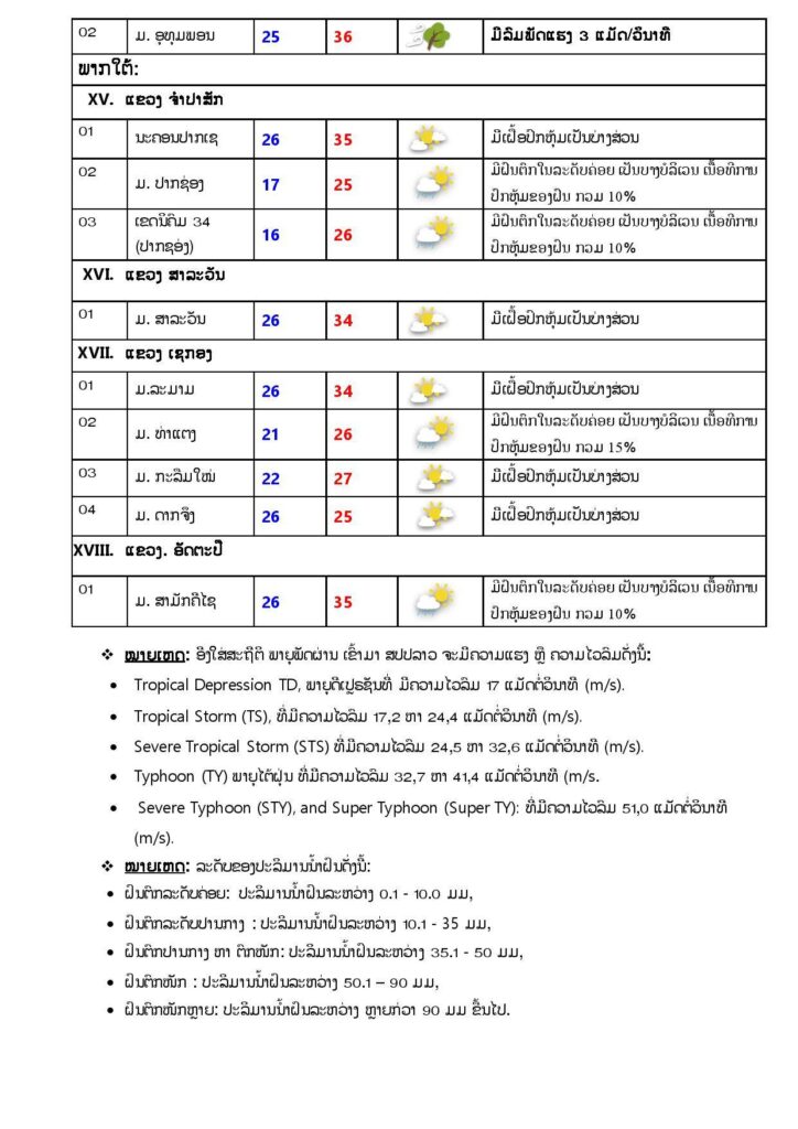 ມວນອາກາດຮ້ອນ ຍັງປົກຄຸມຢູ່ທົ່ວທຸກພາກຂອງປະເທດລາວ ດ້ວຍກໍາລັງປານກາງ, ສົມທົບກັບກະແສລົມຕາເວັນຕົກສ່ຽງໃຕ້ພັດປົກຄຸມ, ເຊິ່ງຈະເຮັດໃຫ້ອາກາດຍັງຈະຮ້ອນ ຫາ ຮ້ອນເອົ້າຢູ່ທົ່ວໄປ ແລະ ອາກາດຈະຮ້ອນເອົ້າຫລາຍໃນຕອນບ່າຍຢູ່ບາງທ້ອງຖິ່ນ ພ້ອມຈະມີຝົນຕົກ ຟ້າຮ້ອງ ຟ້າເຫລື້ອມໃນລະດັບຄ່ອຍ ແລະ ຈະມີລົມພັດແຮງຢູ່ໃນແຕ່ລະພາກຕື່ມອີກ.