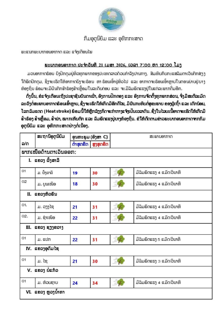 ລາຍງານສະພາບອາກາດປະຈໍາວັນທີ 21 ເມສາ 2026