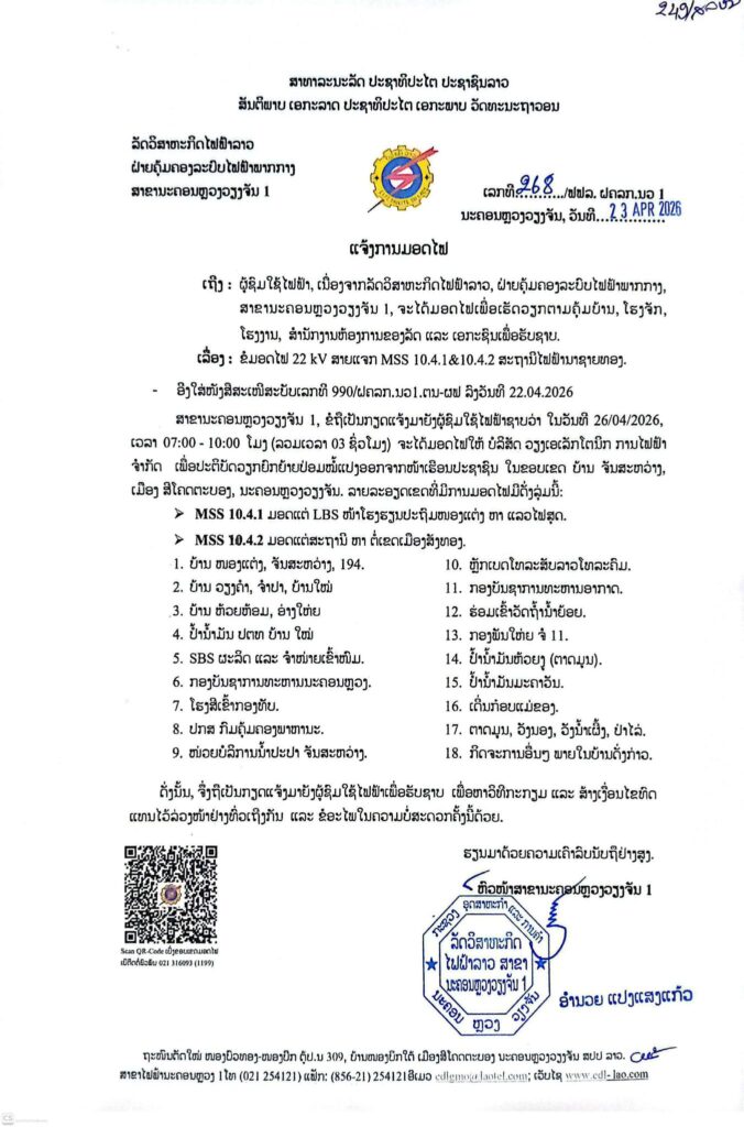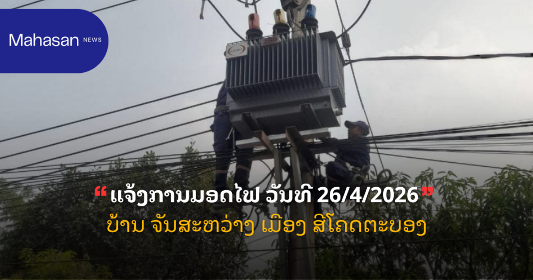 ແຈ້ງການ ແຈ້ງການມອດໄຟ ວັນທີ 26/4/2026 ບ້ານ ຈັນສະຫວ່າງ ເມືອງ ສີໂຄດຕະບອງ By Pele ທີ 24 April, 2026 0 41 Share FacebookXPinterestWhatsApp Must read ທ່ານຮອງລັດຖະມົນຕີ ກະຊວງກະສິກຳ ແລະ ສິ່ງແວດລ້ອມ ຕ້ອນຮັບ ຄະນະຜູ້ແທນ ກະຊວງກະສິກຳ ແລະ ສິ່ງແວດລ້ອມ ສສ ຫວຽດນາມ ທີ 23 April, 2026 ກອງປະຊຸມສະໄໝວິສາມັນຄົບຄະນະເປີດກວ້າງຂອງຄະນະບໍລິຫານງານພັກກະຊວງ ສສກ ຄັ້ງທີ 2 ສະໄໝທີ X ທີ 23 April, 2026 ຕຳຫລວດກຳປູເຈຍ ບຸກມ້າງແກ້ງຄໍເຊັນເຕີ ແລະ ຢາເສບຕິດ ຈັບກຸມຊາວຕ່າງຊາດ 55 ຄົນ ທີ 23 April, 2026 ຍທຂ ຈະປິດເສັ້ນທາງ 4 ແຍກ ໄຟແດງດອນໜູນອຳນວຍຄວາມສະດວກໃຫ້ການສັນຈອນ ທີ 23 April, 2026 Pele ທີ່ມາ:EDL LAOS ລັດວິສາຫະກິດໄຟຟ້າລາວ ສາຂານະຄອນຫຼວງ1 Share FacebookXPinterestWhatsApp Previous articleທ່ານຮອງລັດຖະມົນຕີ ກະຊວງກະສິກຳ ແລະ ສິ່ງແວດລ້ອມ ຕ້ອນຮັບ ຄະນະຜູ້ແທນ ກະຊວງກະສິກຳ ແລະ ສິ່ງແວດລ້ອມ ສສ ຫວຽດນາມ More articles ຍທຂ ຈະປິດເສັ້ນທາງ 4 ແຍກ ໄຟແດງດອນໜູນອຳນວຍຄວາມສະດວກໃຫ້ການສັນຈອນ ທີ 23 April, 2026 ແຈ້ງການມອດໄຟ ວັນທີ 24-25-26/4/2026 ທີ 22 April, 2026 ແຈ້ງການປັບລົງລາຄານ້ຳມັນເຊື້ອໄຟໃນຂອບເຂດທົ່ວປະເທດ ວັນທີ 22 ເມສາ 2026 ເວລາ 06:00 ໂມງ ທີ 22 April, 2026 LEAVE A REPLY Cancel reply Comment: Please enter your comment! Name:* Please enter your name here Email:* You have entered an incorrect email address! Please enter your email address here Website: Save my name, email, and website in this browser for the next time I comment. - Advertisement - Latest article ທ່ານຮອງລັດຖະມົນຕີ ກະຊວງກະສິກຳ ແລະ ສິ່ງແວດລ້ອມ ຕ້ອນຮັບ ຄະນະຜູ້ແທນ ກະຊວງກະສິກຳ ແລະ ສິ່ງແວດລ້ອມ ສສ ຫວຽດນາມ ທີ 23 April, 2026 ກອງປະຊຸມສະໄໝວິສາມັນຄົບຄະນະເປີດກວ້າງຂອງຄະນະບໍລິຫານງານພັກກະຊວງ ສສກ ຄັ້ງທີ 2 ສະໄໝທີ X ທີ 23 April, 2026 ຕຳຫລວດກຳປູເຈຍ ບຸກມ້າງແກ້ງຄໍເຊັນເຕີ ແລະ ຢາເສບຕິດ ຈັບກຸມຊາວຕ່າງຊາດ 55 ຄົນ ທີ 23 April, 2026 ຍທຂ ຈະປິດເສັ້ນທາງ 4 ແຍກ ໄຟແດງດອນໜູນອຳນວຍຄວາມສະດວກໃຫ້ການສັນຈອນ ທີ 23 April, 2026 ເກີດເຫດລົດເມ ປາກເຊ-ວຽງຈັນ ປີ້ນຢູ່ບ້ານນ້ຳເດື່ອ ເມືອງປາກກະດິງ ແຂວງບໍລິຄໍາໄຊໄດ້ຮັບບາດເຈັບ 35 ຄົນ ແລະ ເສຍຊີວິດ 08 ຄົນ. ທີ 22 April, 2026
