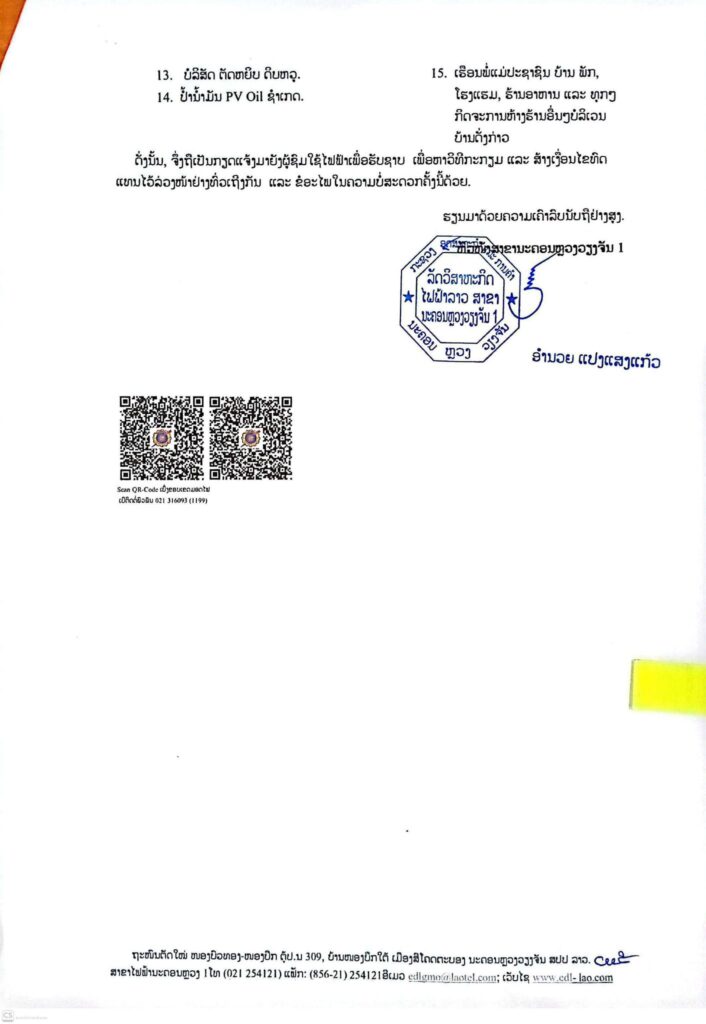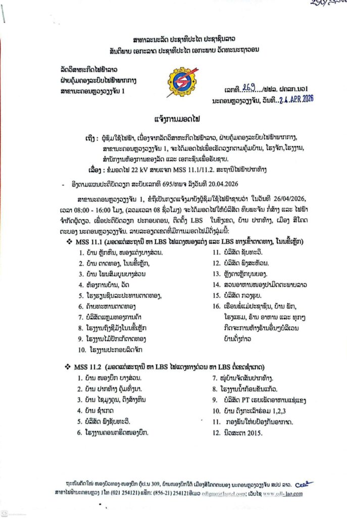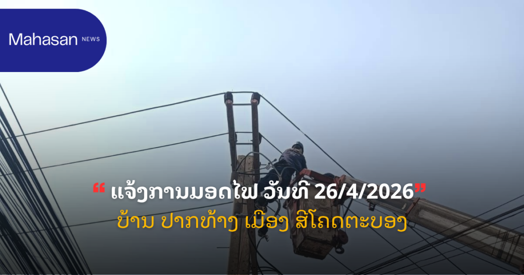 ແຈ້ງການ ແຈ້ງການມອດໄຟ ວັນທີ 26/4/2026 ບ້ານ ປາກທ້າງ ເມືອງ ສີໂຄດຕະບອງ By Pele ທີ 24 April, 2026 0 24 Share FacebookXPinterestWhatsApp Must read “ເມຕາ” ກຳລັງກຽມປົດພະນັກງານ 8,000 ຄົນ ແລະ ທຸ່ມງົບມະຫາສານເພື່ອພັດທະນາ AI ທີ 24 April, 2026 ສປສສ ປາຖະກະຖາວັນສ້າງຕັ້ງຄະນະຊາວໜຸ່ມປະຊາຊົນ ປະຕິວັດລາວ ຄົບຮອບ 71 ປີ ທີ 24 April, 2026 ອິນເດຍຕຳນິທຣັມວ່າ “ບໍ່ມີມາລະຍາດ” ຫຼັງຈາກແຊໂພສທີ່ດ່າອິນເດຍວ່າເປັນ “ຂຸມນະລົກ” ແລະ ກ່າວຄຳວິຈານທີ່ດູຖູກພະນັກງານໄອທີ. ທີ 24 April, 2026 ໄອຍະການເກົາຫຼີໃຕ້ຮ້ອງຂໍໂທດຈຳຄຸກ “ຢຸນ ຊອກ-ຢອນ” 30 ປີ ໃນຄະດີສົ່ງໂດຣນລຸກລ້ຳເກົາຫຼີເໜືອ ທີ 24 April, 2026 Pele ທີ່ມາ:EDL LAOS ລັດວິສາຫະກິດໄຟຟ້າລາວ ສາຂານະຄອນຫຼວງ1 Share FacebookXPinterestWhatsApp Previous articleໄອຍະການເກົາຫຼີໃຕ້ຮ້ອງຂໍໂທດຈຳຄຸກ “ຢຸນ ຊອກ-ຢອນ” 30 ປີ ໃນຄະດີສົ່ງໂດຣນລຸກລ້ຳເກົາຫຼີເໜືອNext articleອິນເດຍຕຳນິທຣັມວ່າ “ບໍ່ມີມາລະຍາດ” ຫຼັງຈາກແຊໂພສທີ່ດ່າອິນເດຍວ່າເປັນ “ຂຸມນະລົກ” ແລະ ກ່າວຄຳວິຈານທີ່ດູຖູກພະນັກງານໄອທີ. More articles ແຈ້ງການມອດໄຟ ວັນທີ 26/4/2026 ບ້ານ ຈັນສະຫວ່າງ ເມືອງ ສີໂຄດຕະບອງ ທີ 24 April, 2026 ຍທຂ ຈະປິດເສັ້ນທາງ 4 ແຍກ ໄຟແດງດອນໜູນອຳນວຍຄວາມສະດວກໃຫ້ການສັນຈອນ ທີ 23 April, 2026 ແຈ້ງການມອດໄຟ ວັນທີ 24-25-26/4/2026 ທີ 22 April, 2026 LEAVE A REPLY Cancel reply Comment: Please enter your comment! Name:* Please enter your name here Email:* You have entered an incorrect email address! Please enter your email address here Website: Save my name, email, and website in this browser for the next time I comment. - Advertisement - Latest article “ເມຕາ” ກຳລັງກຽມປົດພະນັກງານ 8,000 ຄົນ ແລະ ທຸ່ມງົບມະຫາສານເພື່ອພັດທະນາ AI ທີ 24 April, 2026 ສປສສ ປາຖະກະຖາວັນສ້າງຕັ້ງຄະນະຊາວໜຸ່ມປະຊາຊົນ ປະຕິວັດລາວ ຄົບຮອບ 71 ປີ ທີ 24 April, 2026 ອິນເດຍຕຳນິທຣັມວ່າ “ບໍ່ມີມາລະຍາດ” ຫຼັງຈາກແຊໂພສທີ່ດ່າອິນເດຍວ່າເປັນ “ຂຸມນະລົກ” ແລະ ກ່າວຄຳວິຈານທີ່ດູຖູກພະນັກງານໄອທີ. ທີ 24 April, 2026 ໄອຍະການເກົາຫຼີໃຕ້ຮ້ອງຂໍໂທດຈຳຄຸກ “ຢຸນ ຊອກ-ຢອນ” 30 ປີ ໃນຄະດີສົ່ງໂດຣນລຸກລ້ຳເກົາຫຼີເໜືອ ທີ 24 April, 2026 ແຈ້ງການມອດໄຟ ວັນທີ 26/4/2026 ບ້ານ ຈັນສະຫວ່າງ ເມືອງ ສີໂຄດຕະບອງ ທີ 24 April, 2026