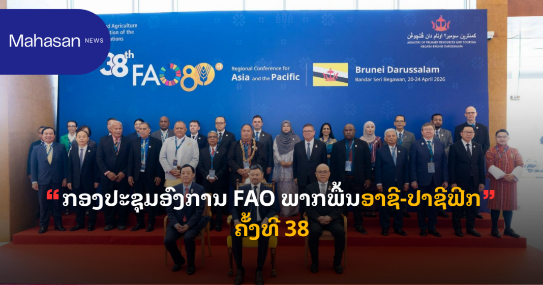 ໃນລະຫວ່າງວັນທີ 22-24 ເມສາ ຜ່ານມານີ້, ທ່ານ ລິນຄໍາ ດວງສະຫວັນ ລັດຖະມົນຕີ ກະຊວງກະສິກຳ ແລະ ສິ່ງແວດລ້ອມ ພ້ອມຄະນະ ໄດ້ເຂົ້າຮ່ວມກອງປະຊຸມ ອົງການອາຫານ ແລະ ການກະເສດ ພາກພື້ນອາຊີ-ປາຊີຟິກ ຄັ້ງທີ 38 (The Thirty–Eighth Session of the FAO Regional Conference for Asia and Pacific – APRC-38) ຊຶ່ງຈັດຂຶ້ນ ທີ່ ປະເທດ ບຣູໄນ ດາຣູຊາລາມ, ໂດຍມີ ຫົວໜ້າກົມກ່ຽວຂ້ອງປະກອບໃນຄະນະ ຄື: ກົມແຜນການ ແລະ ການຮ່ວມມື, ກົມປູກຝັງ ແລະ ກົມສົົ່ງເສີມກະສິກໍາ ແລະ ສະຫະກອນ ເຂົ້າຮ່ວມ. ກອງປະຊຸມດັ່ງກ່າວ ປະກອບມີບັນດາ ລັດຖະມົນຕີ, ຮອງລັດຖະມົນຕີ ແລະ ຜູ້ຕາງໜ້າ ຈາກປະເທດສະມາຊິກ ທັງໝົດ 46 ປະເທດ, ເລຂາທິການອົງການອາຫານ ແລະ ການກະເສດ, ຕາງໜ້າອົງການອາຫານ ແລະ ການກະເສດ ຂອງແຕ່ລະປະເທດ ແລະ ຄູ່ຮ່ວມພັດທະນາຕ່າງໆ ເຂົ້າຮ່ວມຢ່າງພ້ອມພຽງ.