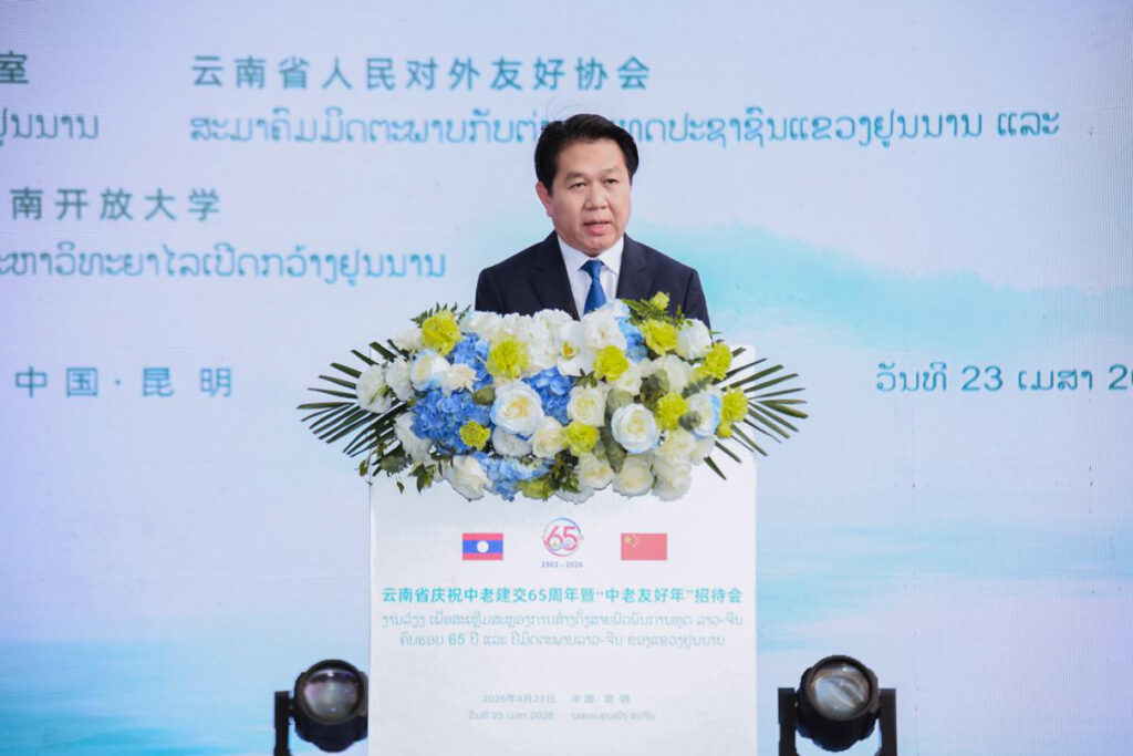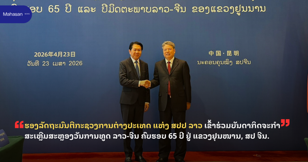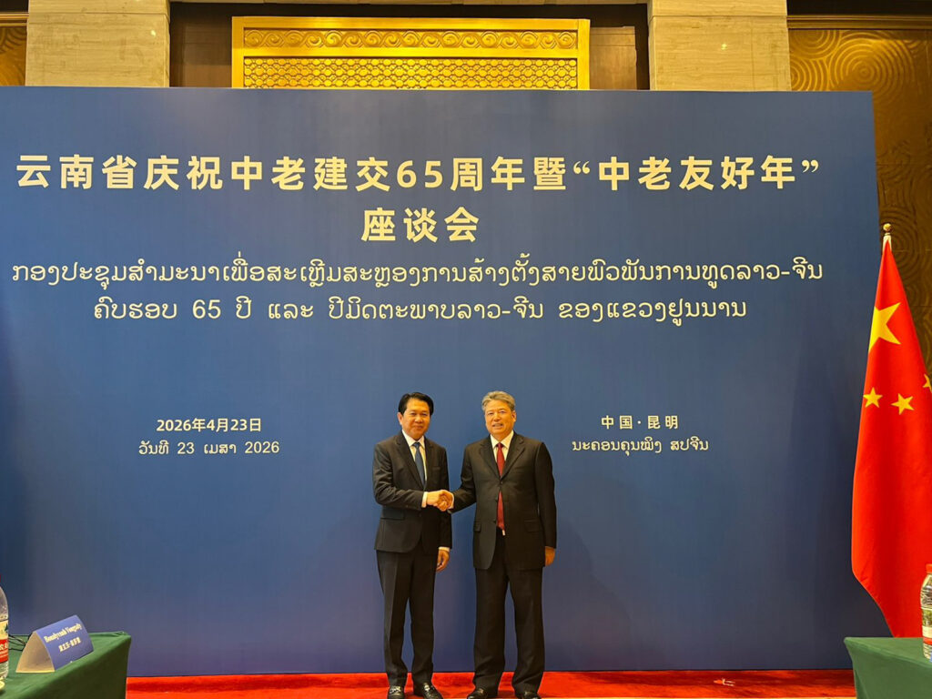 ວັນທີ 23 ເມສາ 2026, ທ່ານ ຮອງລັດຖະມົນຕີ ອານຸພາບ ວົງໜໍ່ແກ້ວ ໄດ້ເຂົ້າຮ່ວມ ແລະ ເປັນກຽດກ່າວຄໍາເຫັນໃນກອງປະຊຸມສໍາມະນາ ເພື່ອສະເຫຼີມສະຫຼອງການສ້າງຕັ້ງສາຍພົວພັນການທູດ ລາວ-ຈີນ ຄົບຮອບ 65 ປີ ແລະ ປີມິດຕະພາບ ລາວ-ຈີນ ຂອງແຂວງຢຸນໜານ ໂດຍມີຜູ້ຕາງໜ້າຈາກສະພາການຄ້າ ແລະ ອຸດສາຫະກໍາແຫ່ງຊາດລາວ ພ້ອມດ້ວຍຫົວໜ່ວຍທຸລະກິດ ລາວ-ຈີນ, ຕົວແທນນັກສຶກສາລາວ ທີ່ກໍາລັງສຶກສາຢູ່ແຂວງຢຸນນານ ແລະ ບັນດາສື່ມວນຊົນ ເຂົ້າຮ່ວມຫຼາຍກວ່າ 80 ທ່ານ. ຈາກນັ້ນ, ທ່ານຮອງລັດຖະມົນຕີ ກະຊວງການຕ່າງປະເທດ ໄດ້ສືບຕໍ່ເຂົ້າຮ່ວມ ແລະ ມີຄໍາເຫັນໃນງານລ້ຽງສະເຫຼີມສະຫຼອງວັນສ້າງຕັ້ງສາຍພົວພັນການທູດ ລາວ-ຈີນ ຄົບຮອບ 65 ປີ ແລະ ປີມິດຕະພາບ ລາວ-ຈີນ ຂອງແຂວງຢຸນໜານ, ໂດຍການເປັນເຈົ້າພາບຮ່ວມກັນ ລະຫວ່າງ ສະຖານກົງສຸນໃຫຍ່ ແຫ່ງ ສປປ ລາວ ທີ່ ນະຄອນຄຸນໝິງ ແລະ ສະມາຄົມມິດຕະພາບກັບຕ່າງປະເທດຂອງແຂວງຢຸນໜານ, ຫ້ອງການພົວພັນຕ່າງປະເທດແຂວງຢຸນໜານ, ເຊີ່ງການນໍາຂັ້ນສູງຂອງແຂວງຢຸນໜານ ນໍາໂດຍ ທ່ານ ເຣີ້ນ ຈຸ່ນຮ້າວ, ຮອງປະທານຄະນະປະຈໍາ ສະພາຜູ້ແທນປະຊາຊົນແຂວງຢຸນໜານ ແລະ ພະແນກການທີ່ກ່ຽວຂອງຂອງແຂວງ ແລະ ຈາກ ສປປ ລາວ ເຂົ້າຮ່ວມ.