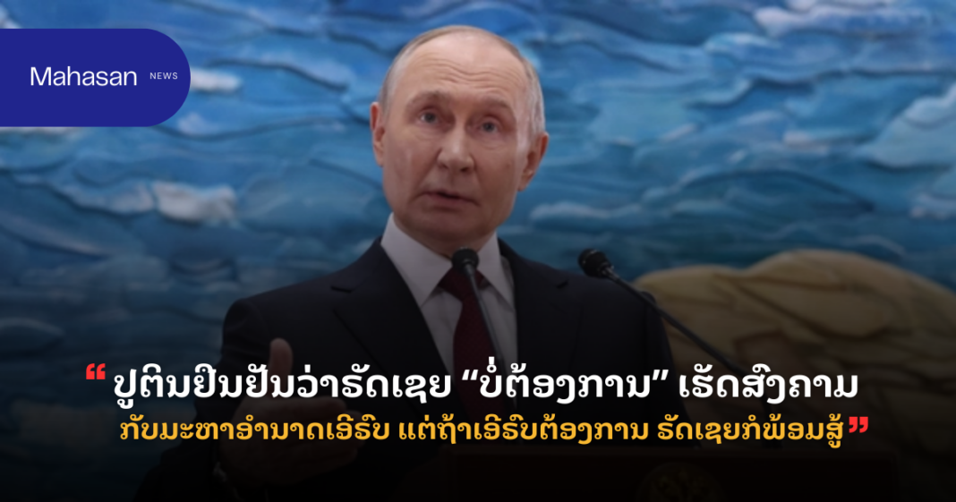 ຜູ້ນຳຣັດເຊຍກ່າວວ່າ ພວກເຮົາບໍ່ໄດ້ວາງແຜນຈະສູ້ກັບເອີຣົບ ຂ້ອຍໄດ້ເວົ້າເລື່ອງນີ້ຫຼາຍຮ້ອຍຄັ້ງແລ້ວ ແຕ່ຖ້າເອີຣົບຕັດສິນໃຈເຮັດສົງຄາມກັບພວກເຮົາ ແລະເປັນຝ່າຍເລີ່ມກ່ອນ ພວກເຮົາກໍພ້ອມທັນທີ ບໍ່ມີຂໍ້ສົງໄສໃດໆໃນເລື່ອງນີ້. ຄຳຖາມຄື ຖ້າເອີຣົບເລີ່ມສົງຄາມກັບພວກເຮົາ ຂ້ອຍເຊື່ອວ່າໃນເວລາບໍ່ດົນ ພວກເຂົາຈະພ່າຍແພ້ທັນທີ. ນີ້ບໍ່ແມ່ນຢູເຄຣນ ສຳລັບຢູເຄຣນ ພວກເຮົາດຳເນີນການແບບສັນຕິພາບ ຢ່າງລະມັດລະວັງ ມັນບໍ່ແມ່ນສົງຄາມເຕັມຮູບແບບໃນຄວາມເຂົ້າໃຈສະໄໝໃໝ່ ແຕ່ຖ້າເອີຣົບເລືອກເລີ່ມສົງຄາມ ສະຖານະການອາດຈະໄປຮອດຈຸດທີ່ບໍ່ມີໃຜໃຫ້ພວກເຮົານັ່ງລົງເຈລະຈາດ້ວຍອີກຕໍ່ໄປ.
